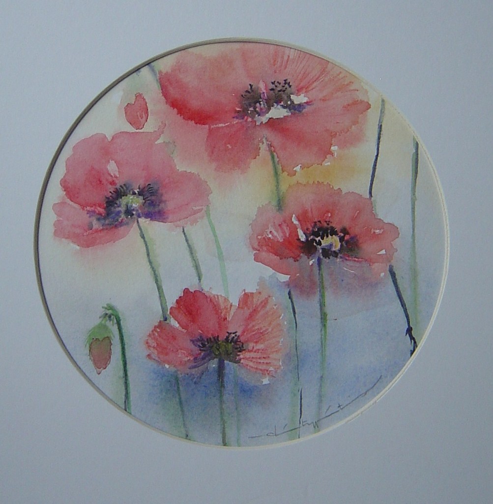 Kleine aquarel in rond passepartout.