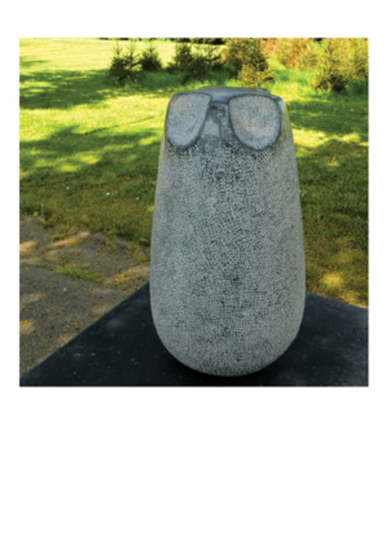 Koning Uil is gemaakt van Belgisch Hardsteen. De bovenkant van deze vorm is ook afgeleid van een petfles. Nu met vijf inkervingen. Van onder naar boven steeds fijner geschuurd. De onderkant is afgerond, maar het beeld staat best stabiel.
