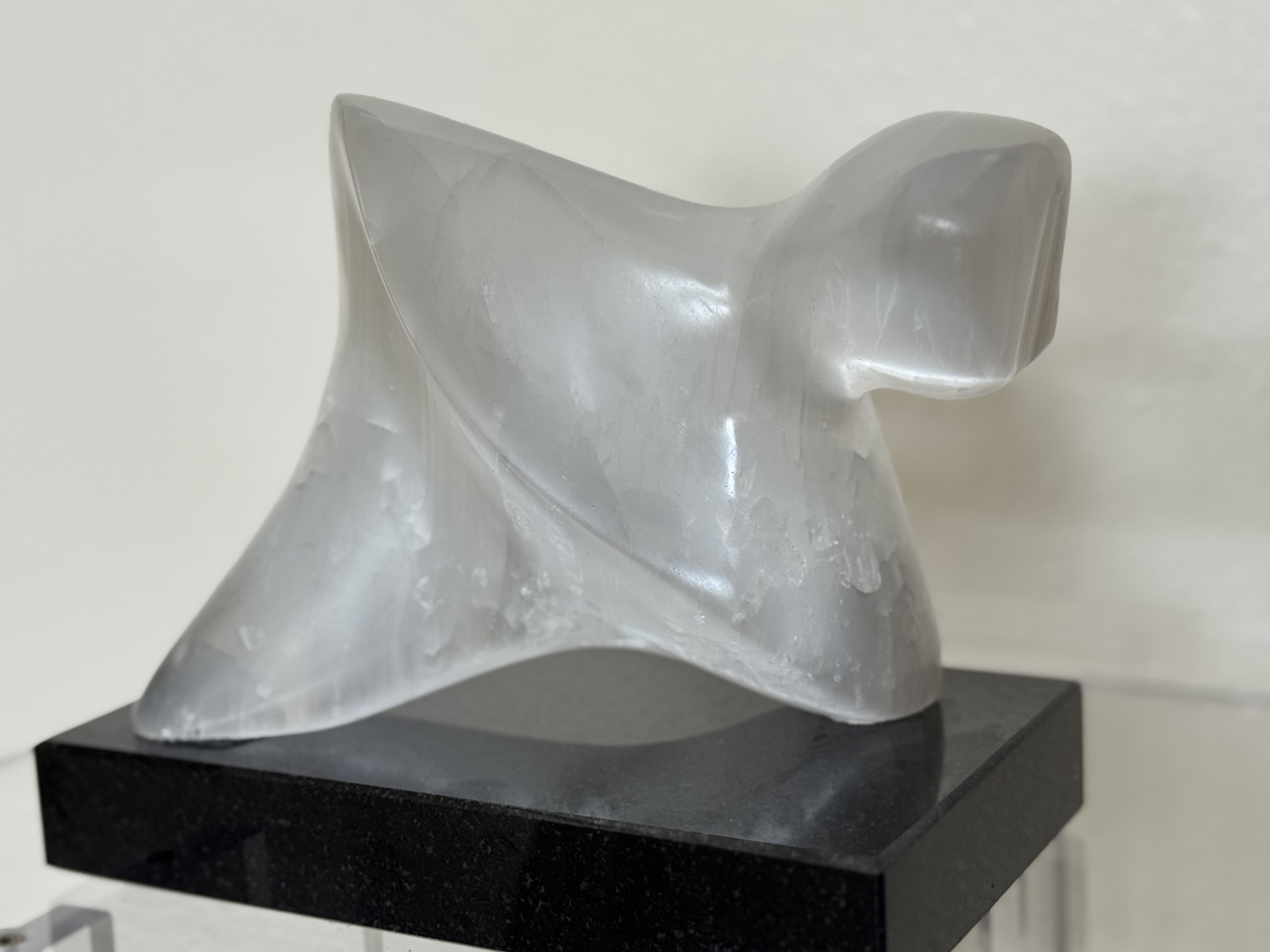 Nieuwsgierig? ik steek m'n nek uit om te zien wat er beneden gebeurt. Gemaakt van Seleniet een zachte doch lastige steen om te bewerken. Door de opbouw van hele kleine staafjes breekt het erg snel. Is semi-Transparant en glasachtig.
