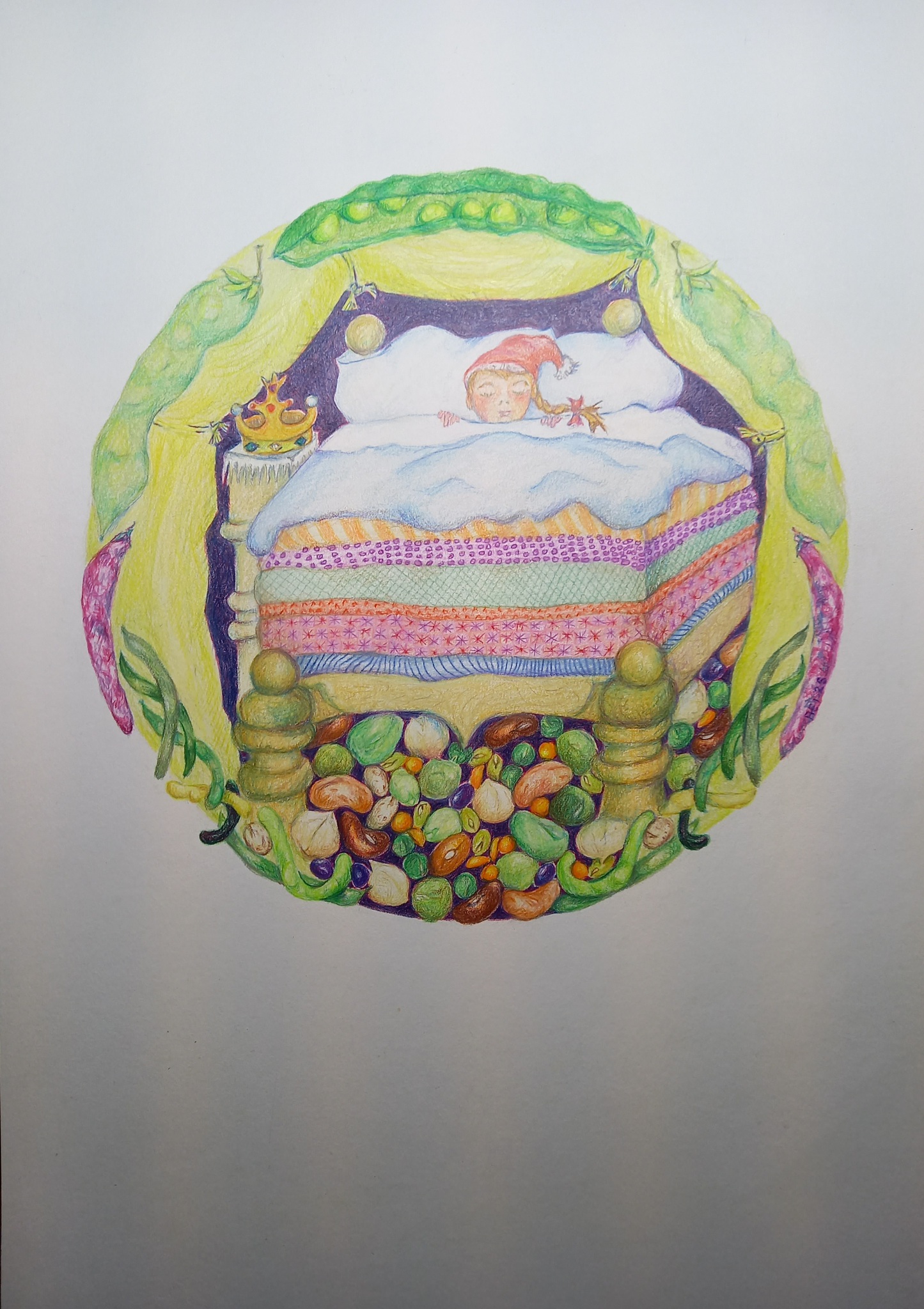 Sprookje Andersen Kleurpotlood Prinses-op-de-erwt Bonen Erwten Slapen Matrassen Bed Prinses Slaapmutsje Illustratie