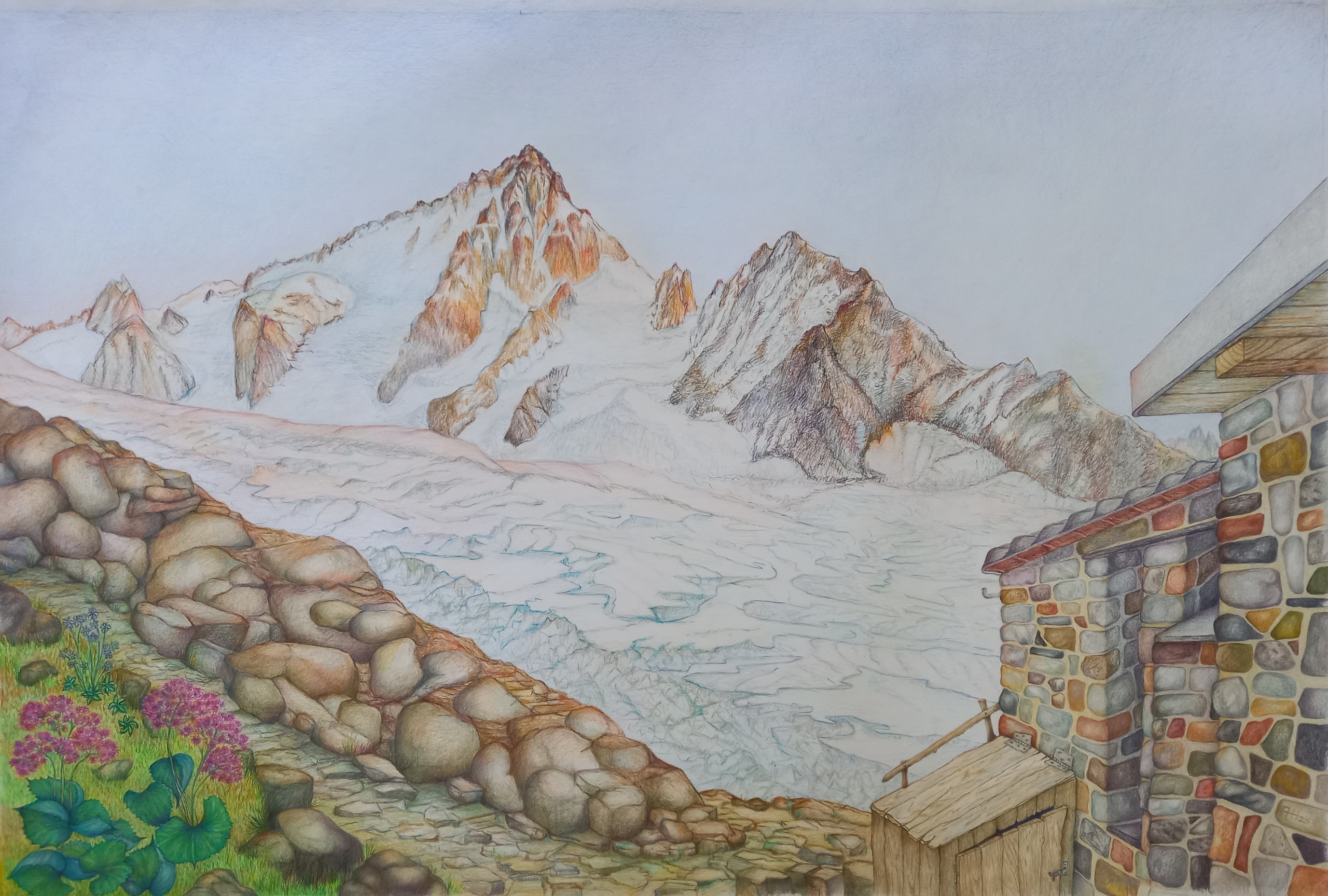 Frankrijk Tekening Bergen Berglandschap Kleurpotlood Alpen Gletsjer Cabane Berghut Refuge Morenen Aiguille Chardonnet Klierstijl Albert1e
