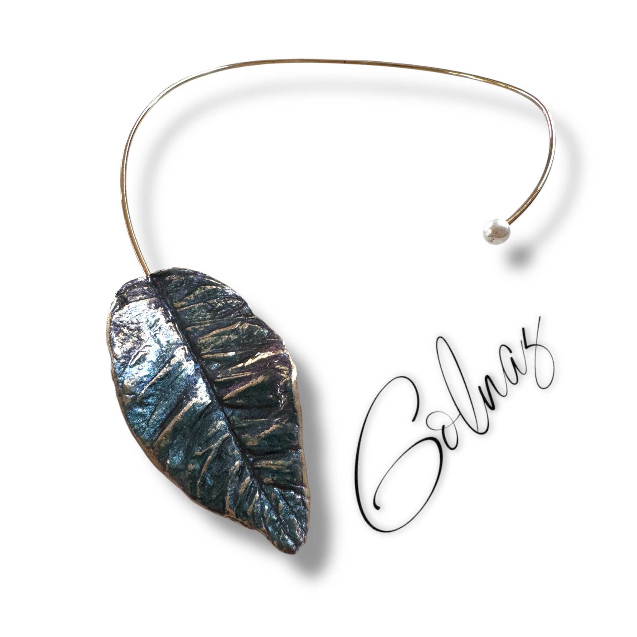 Bronzen sieraad in de vorm van een blad aan een spang van verguld staal