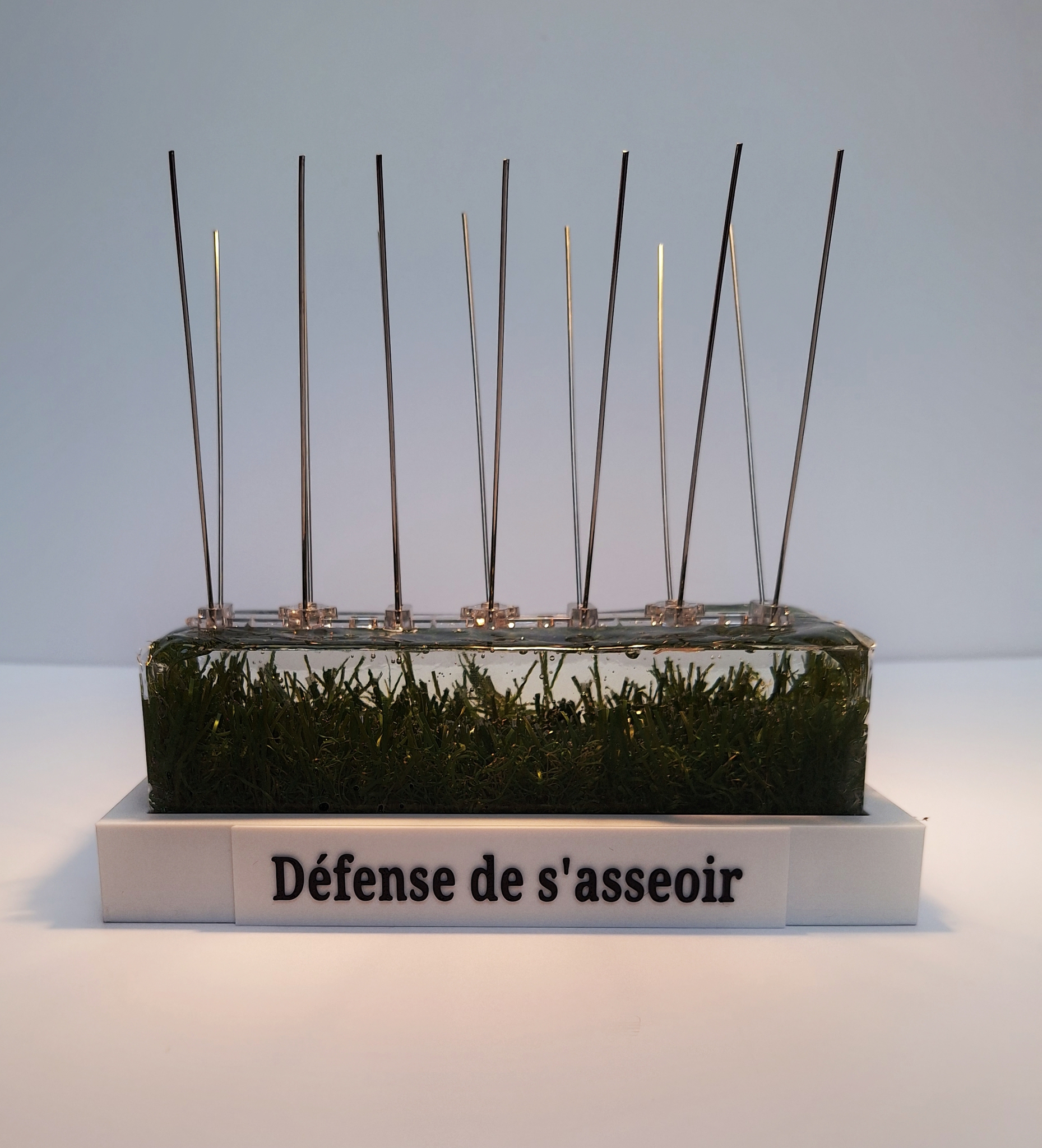 A patch of artificial grass, inviting and familiar, is cast in resin and pierced by metal spikes. What promises comfort and accessibility is instantly withdrawn, transformed into a surface of exclusion. The inscription “Défense de s’asseoir” makes explicit what the object already declares. Normally, prohibition operates in a single register: either through text (law, language) or through material impediment (spikes, physical force). Here, both are imposed simultaneously, a double prohibition that renders the interdiction excessive and even absurd. The work refers to hostile architecture: urban strategies that prevent rest, gathering, or shelter, often targeting the most vulnerable. In this miniature, it becomes clear that control in public space is never neutral: hospitality is evoked only to be withdrawn, freedom promised only to be denied.
