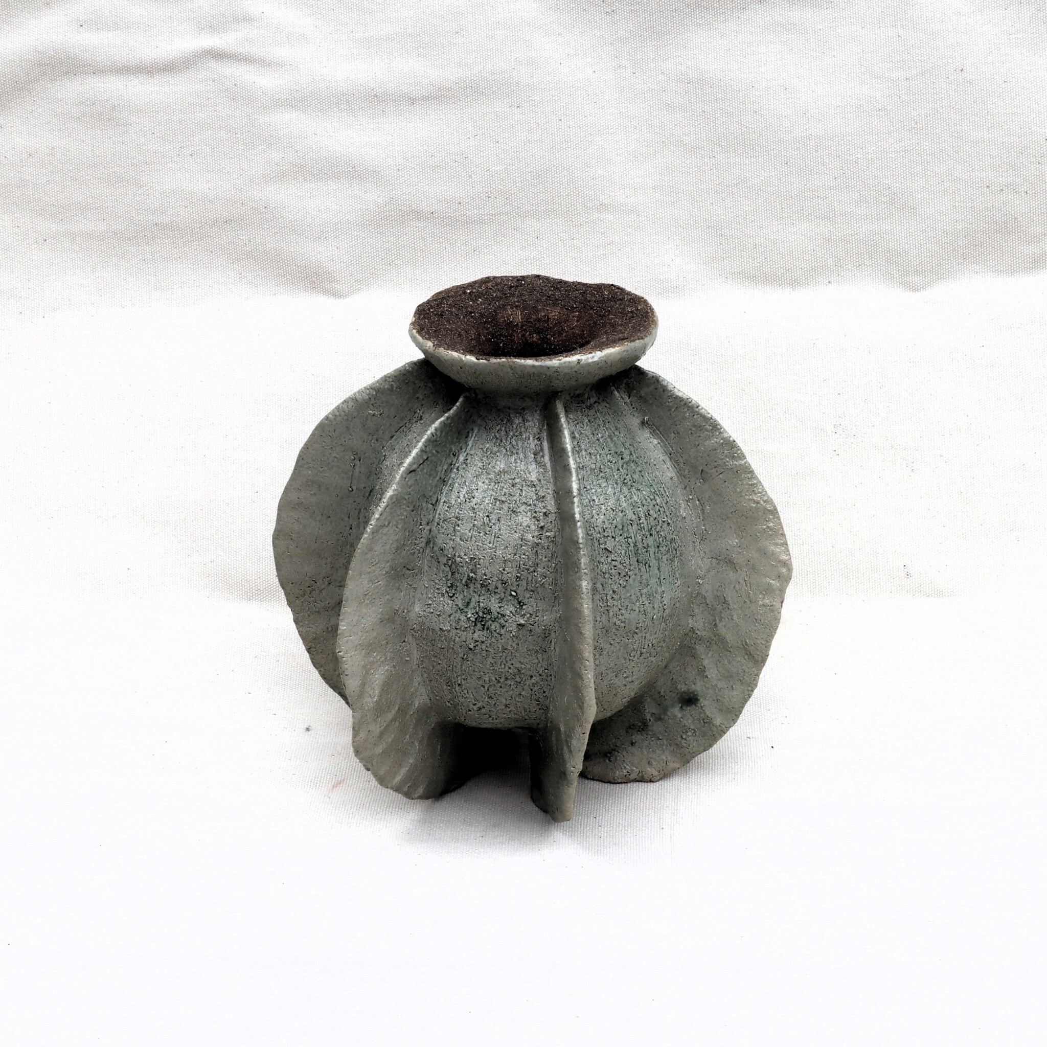 Geen vaas, maar een vorm die zich ontvouwt. Een bol van klei, omsloten door golvende vleugels, waar aarde en beweging elkaar raken.