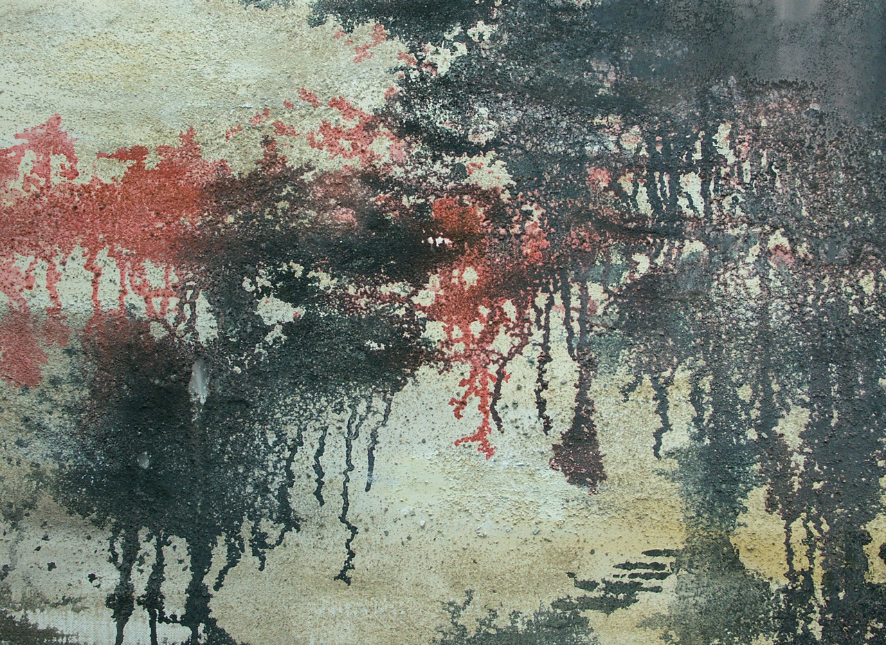 Structuur op doek die mij doet denken aan de tempels in Hue (Vietnam). Acryl, ecoline en zand op doek.