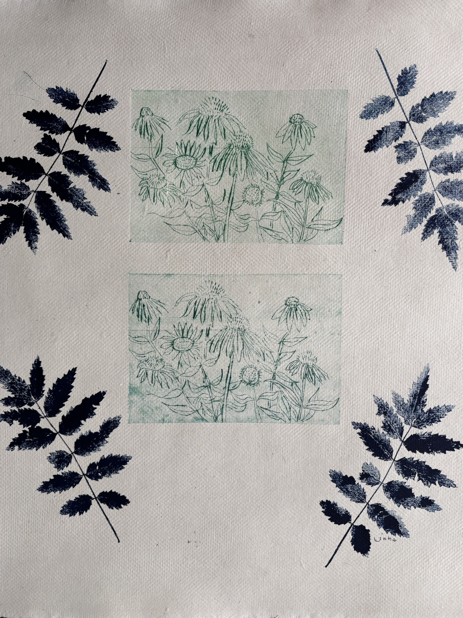 gecombineerde afdruk van een droge naald techniek op een tetrapak en een monoprint van een klein takje met blad