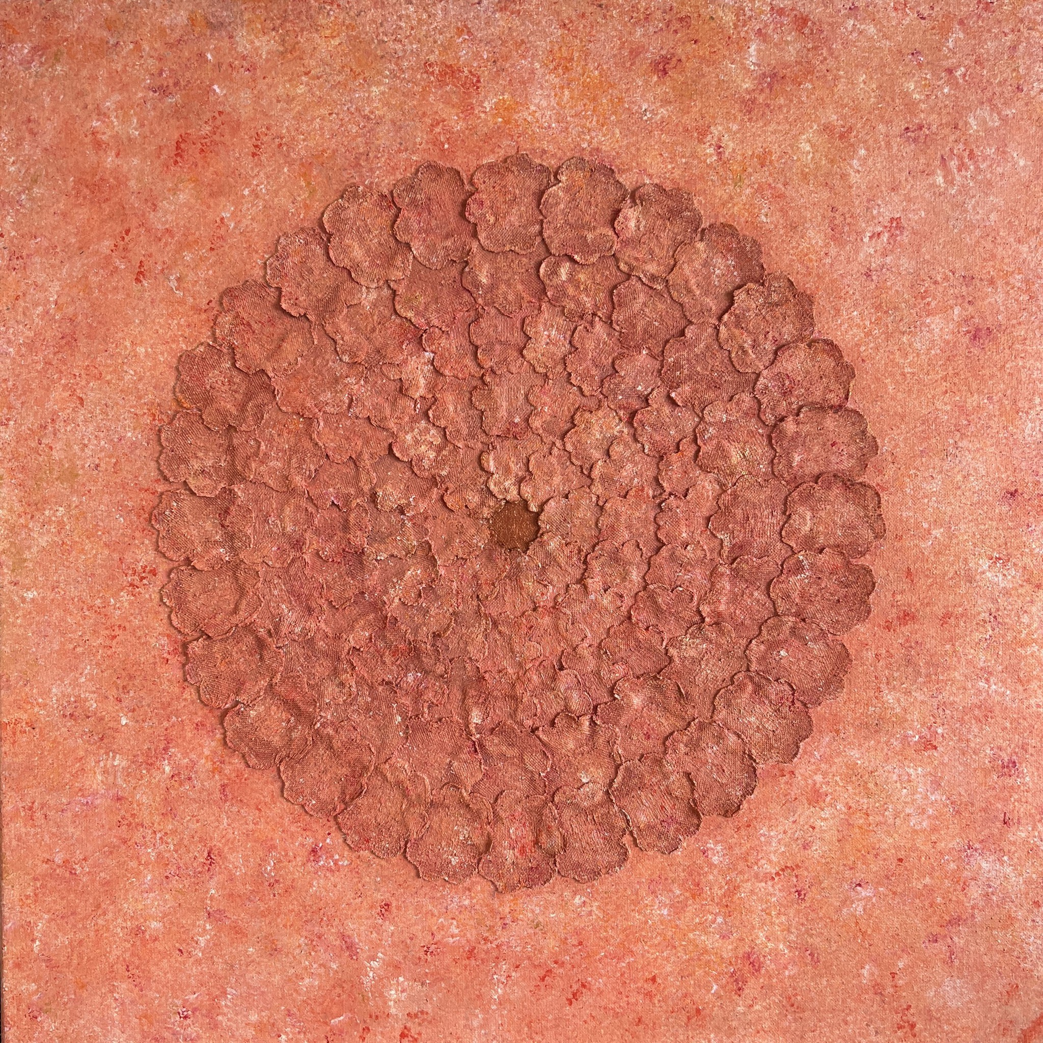 Combinatie van textiel met acrylverf. Uit een favoriet jasje zijn alle bloemen geknipt, bewerkt met verf en geordend in een cirkel.