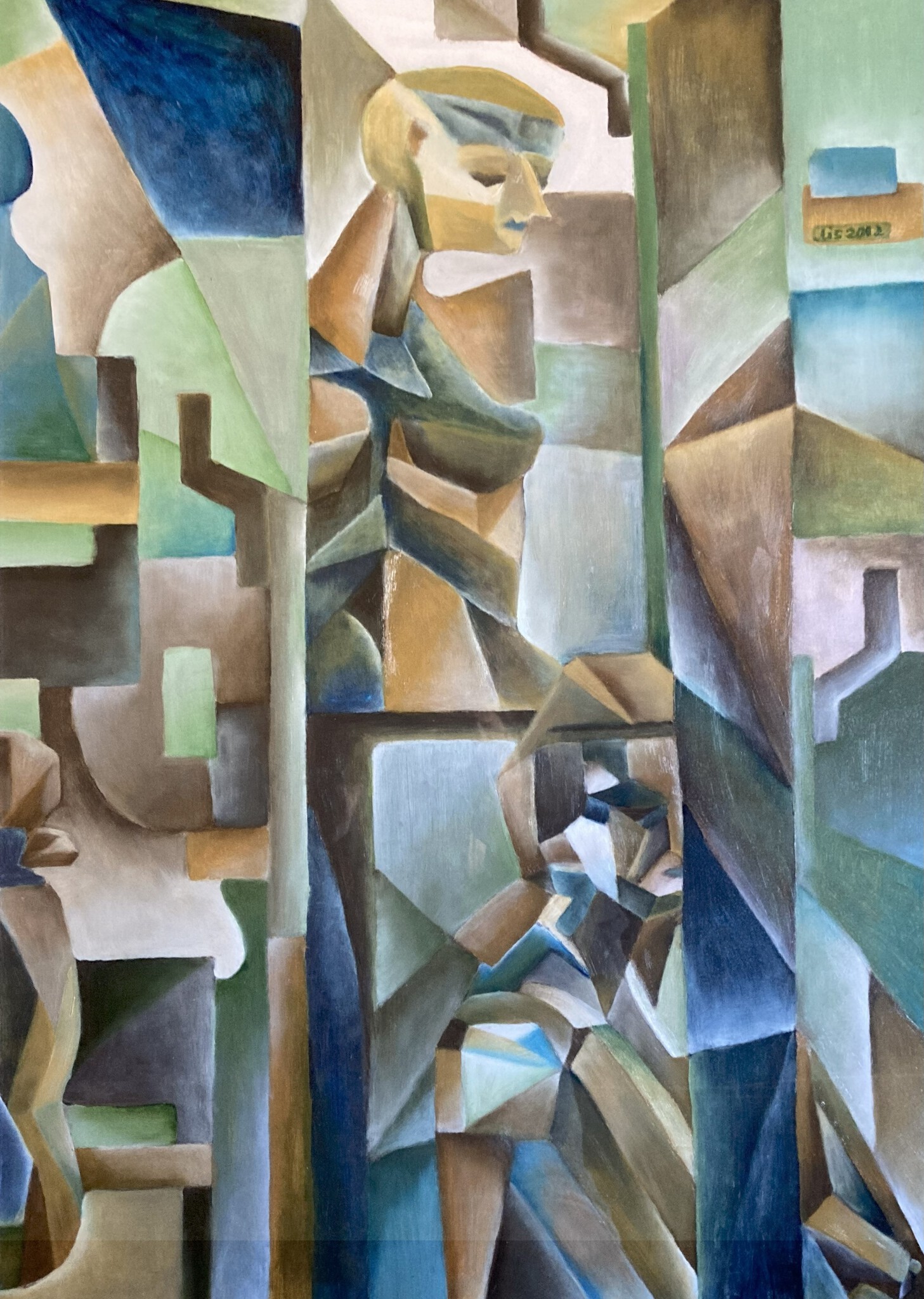 Blauw Vrouw Olieverf Abstractie Compositie Grijstinten Bruintinten