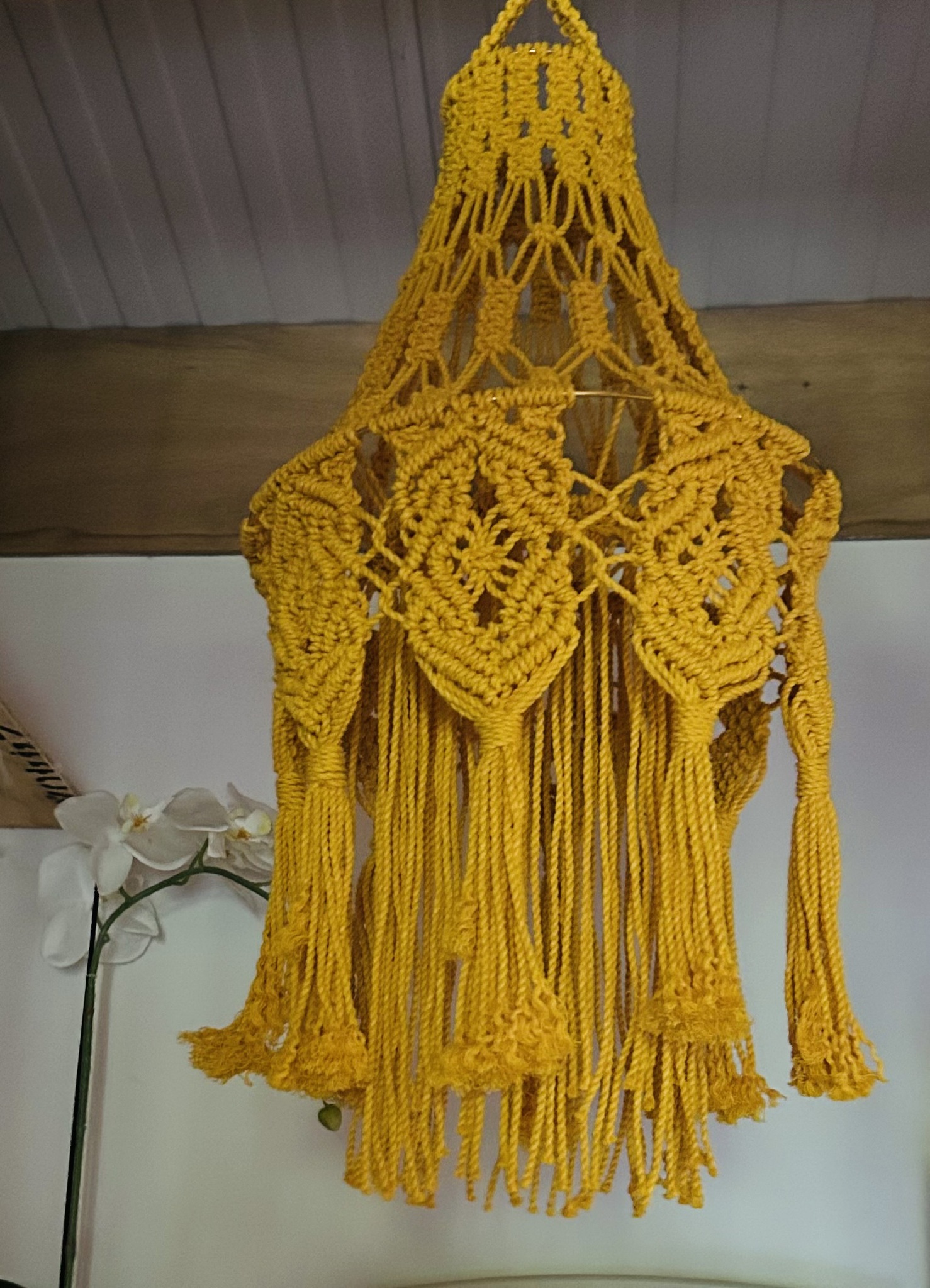 Lantaarn gemaakt van macramé werk, creeert oosterse sfeer met diffus verspreiden van licht.