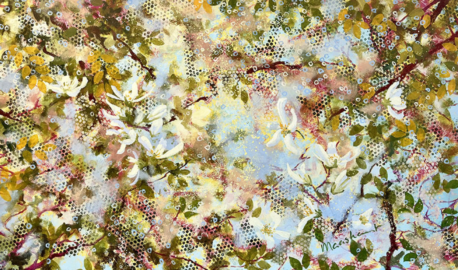 Vroeg in het voorjaar, een boswandeling, inspiratie. De krenteboompjes staan altijd al vroeg in bloei, verder is er nog weinig blad aan de bomen waardoor er nog veel lucht tussen de takken door schittert.