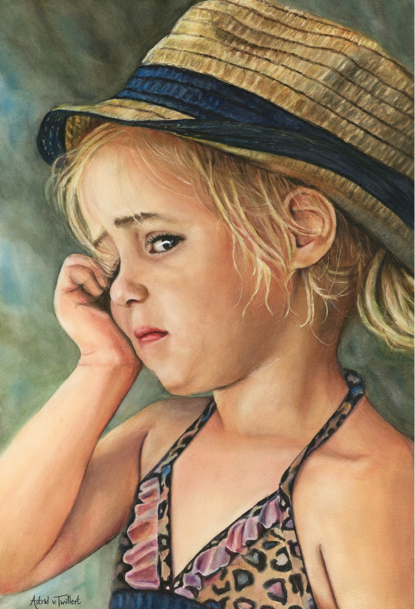 Meisje Kind Portret Baby Gezicht Aquarel Realistisch Giclee Aquarelportret Hoedje ''''gelimiteerde Oplage''''