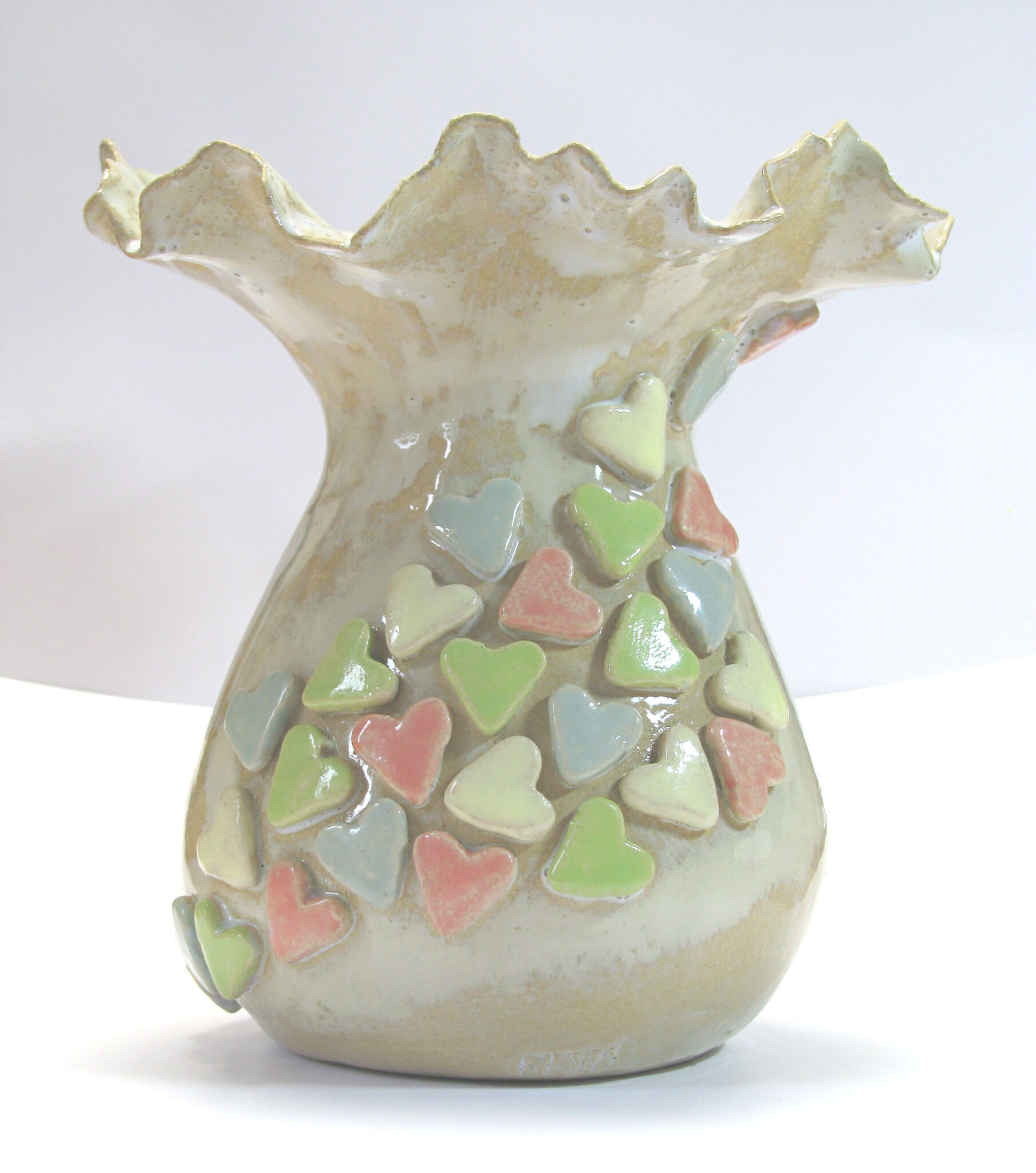 handgevormde vazen veelal met motieven als harten, klavers, bloemetjes