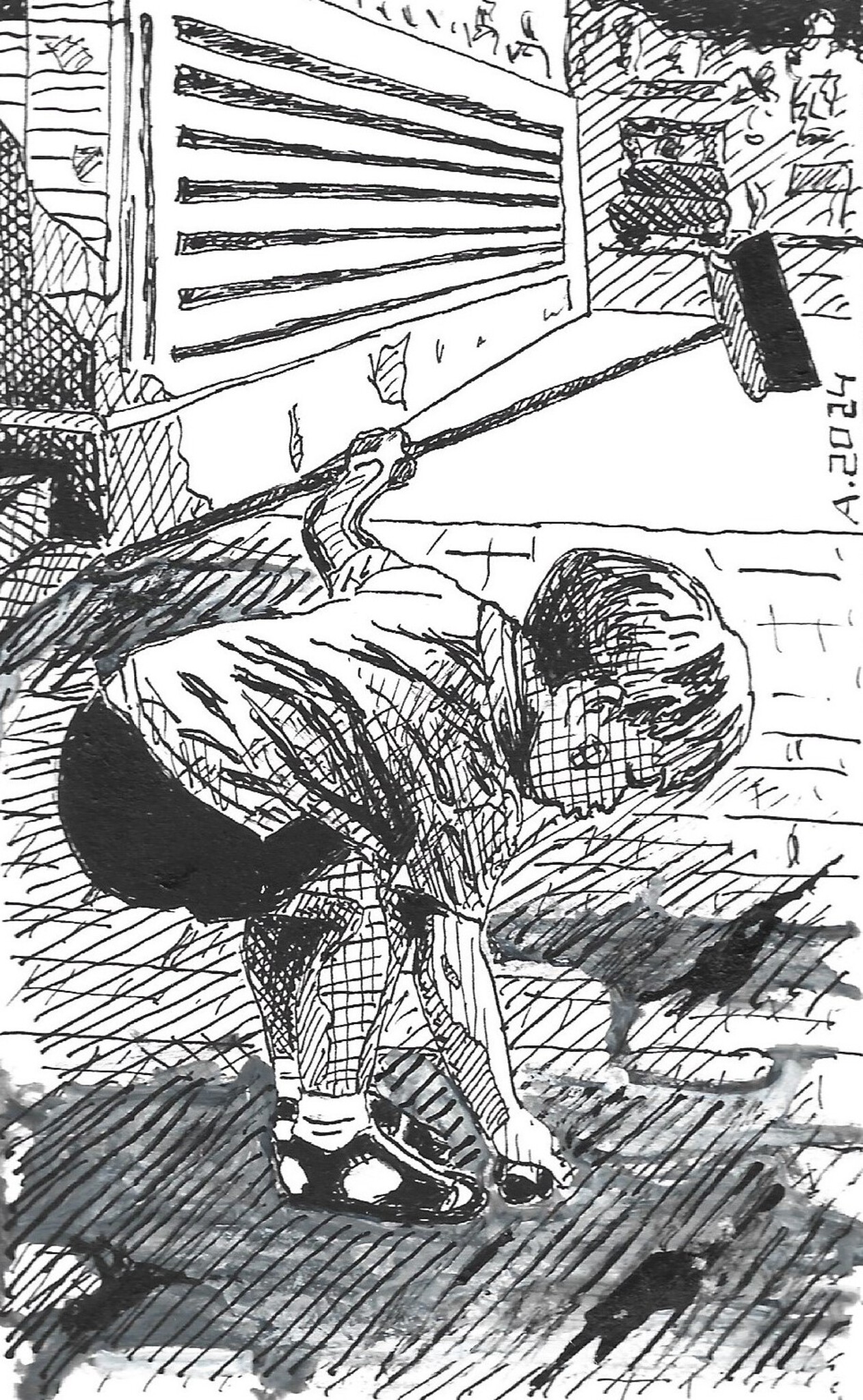 Tekening van jongen met bezem.