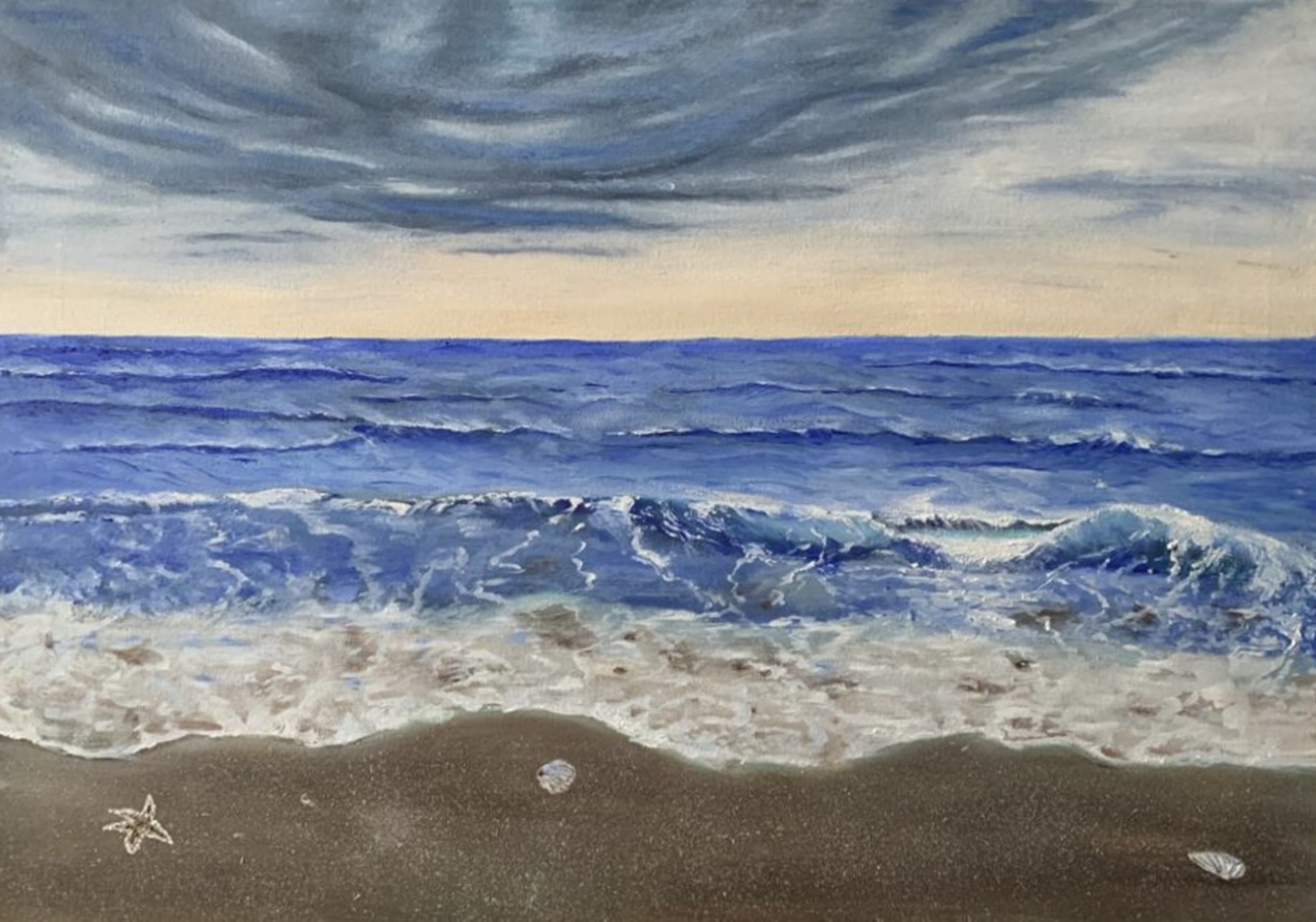 De Noordzee vanaf het strand bij Castricum, geschilderd voor de kaft van de roman UITDAM van haar partner Fred Sanders
