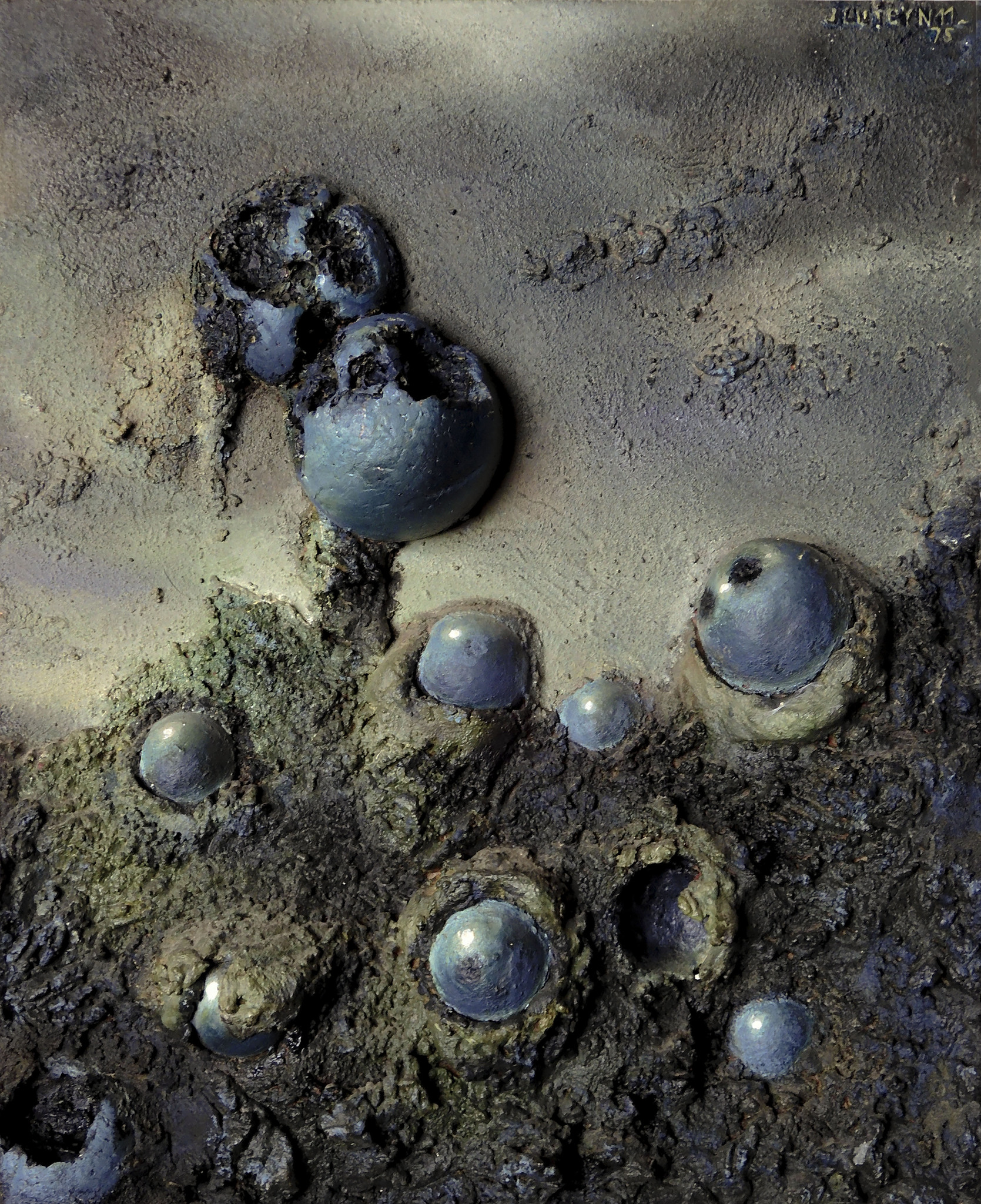 Organische fantasiebollen die opstijgen uit sediment en vervolgens worden aangetast door giftige gassen in de atmosfeer, en daardoor zullen verdwijnen uit de geschiedenis. Gemaakt van kunsthars o.a en beschilderd met olieverf. Het werk is in wit meubelplaat bevestigd met het formaat 40 x 45 cm.