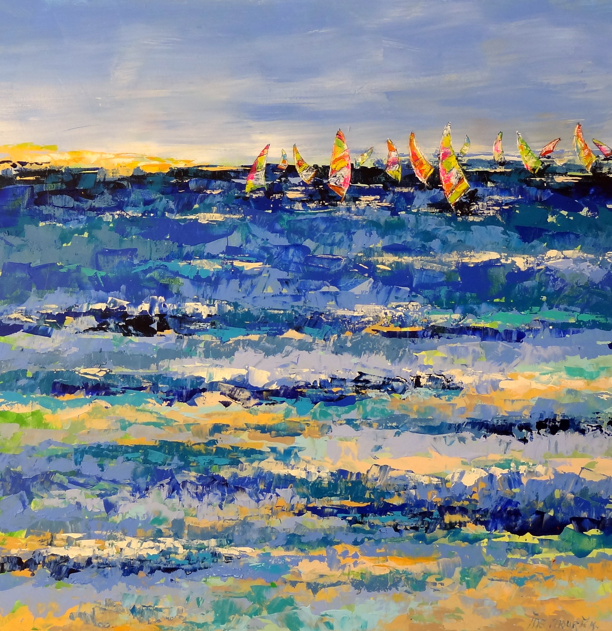 Mijn inspiratie: De zeilen van surfers in een ruwe zee. De kleurrijke zeilen van de surfers vormen een mooi contrast met het donker blauwe water. De zijkanten van het doek zijn meegeschilderd. Inclusief houten baklijst in de kleuren zwart en zilver.