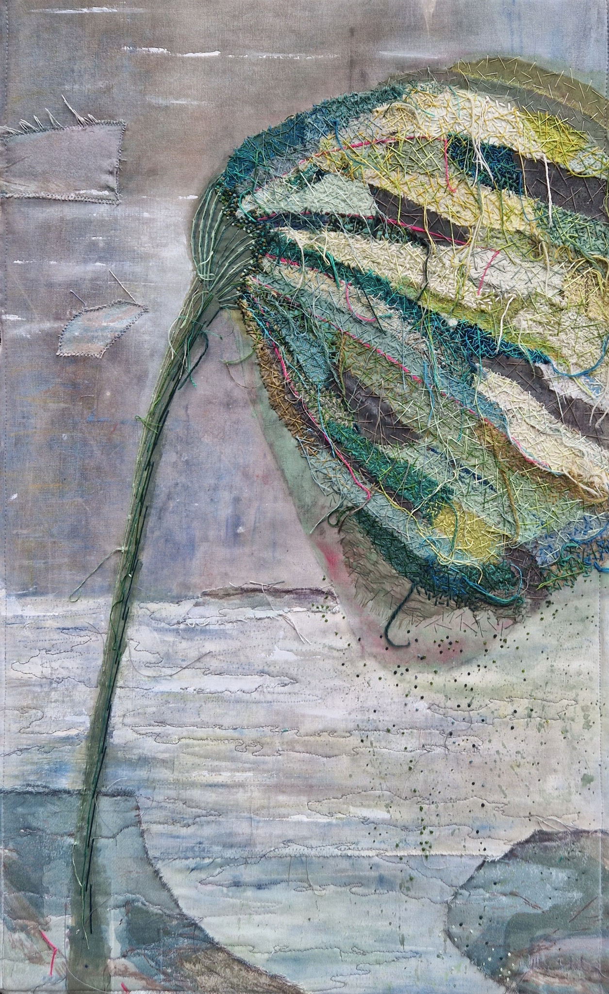 Hand borduurwerk en applicatie op een met verf bewerkte ondergrond stof.