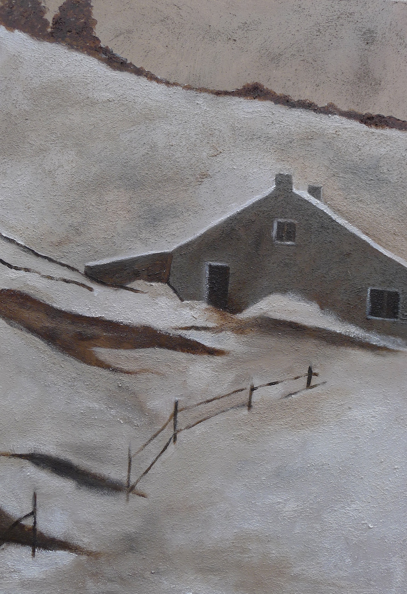Boerderij in de sneeuw op een heuvel