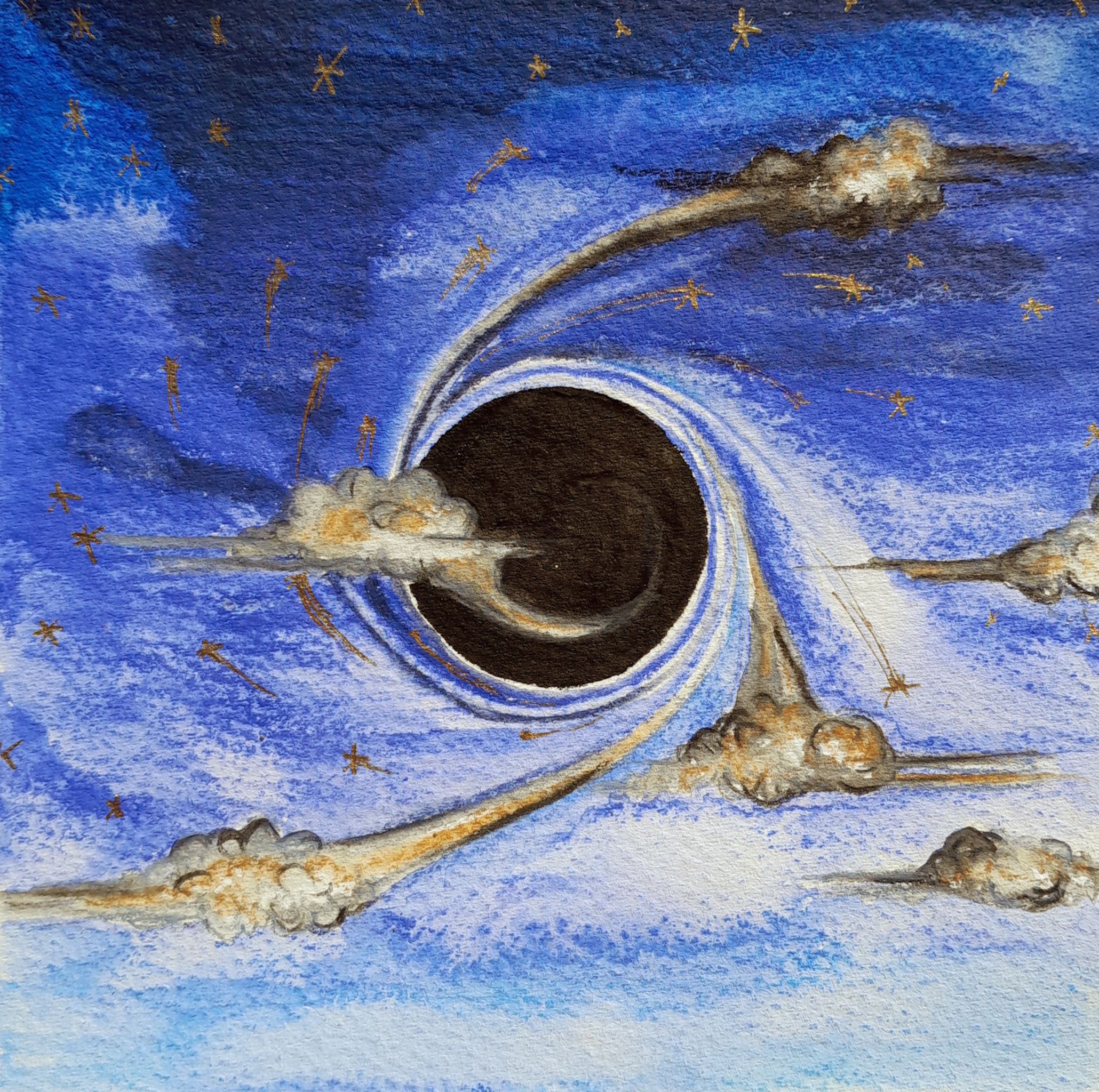 Wolken en sterren verdwijnen in een zwart gat. Aquarelpotlood en water op 300 grams aquarelpapier.