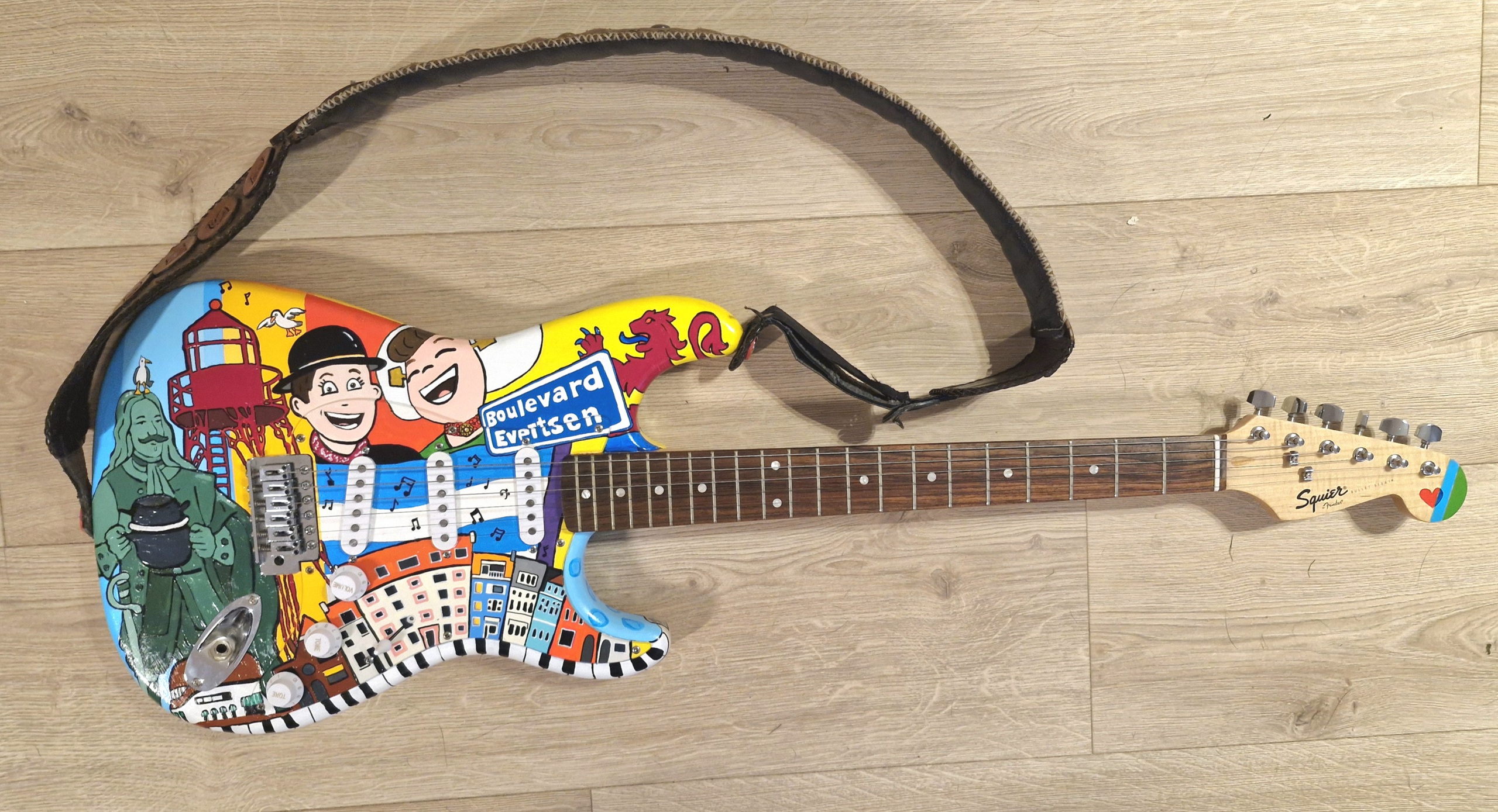 Een mooie uitdaging voor een bekende Zeeuwse band, muziek en kunst komen samen in deze unieke handgeschilderde gitaar. Michiel de Ruyter met een mosselpan, de zeeuwsevlag een boer en boerin en natuurlijk heel Vlissingen zingt.