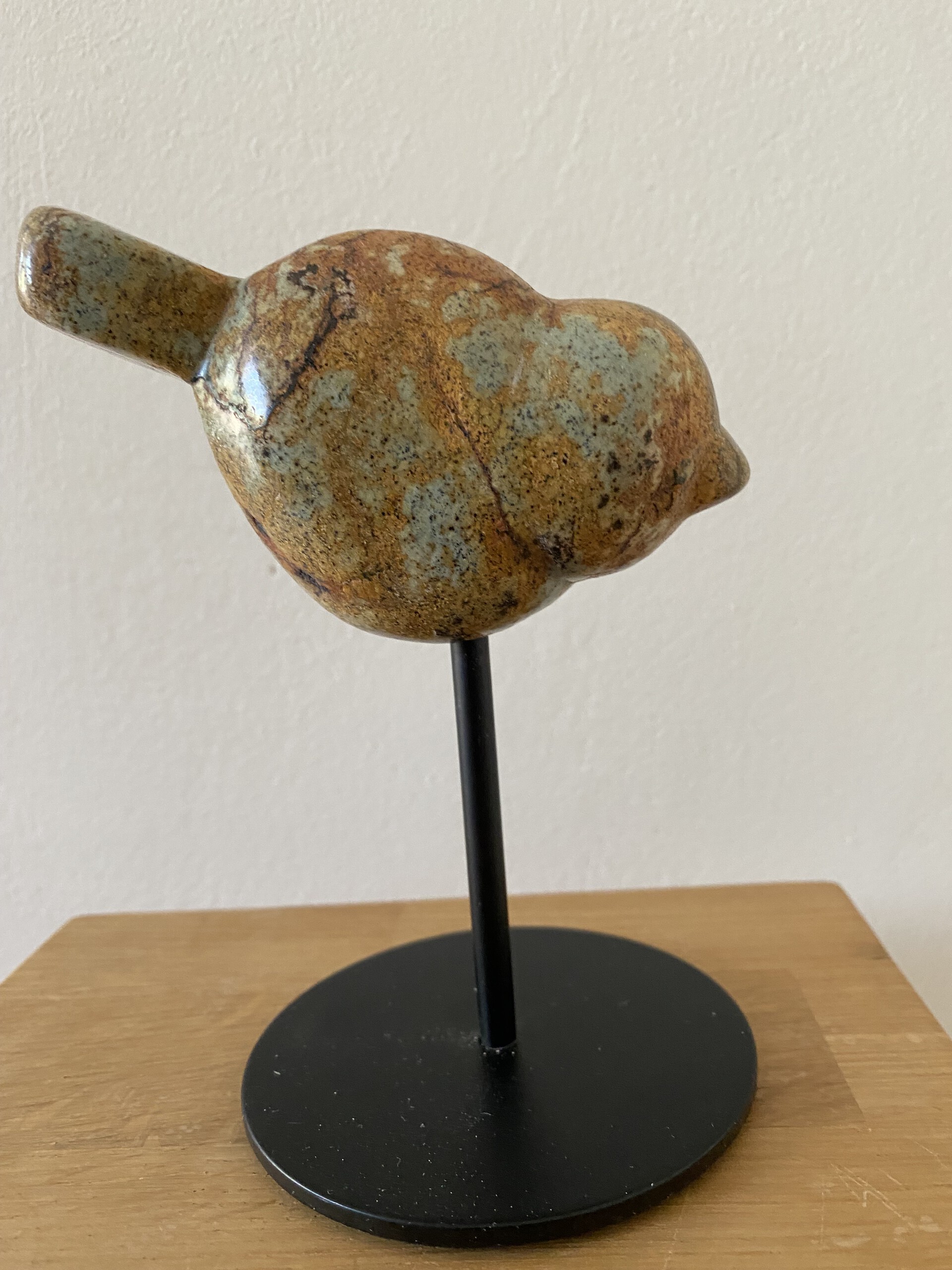 Vogeltje uit Braziliaans speksteen (bruin) op zwarte stalen sokkel.
