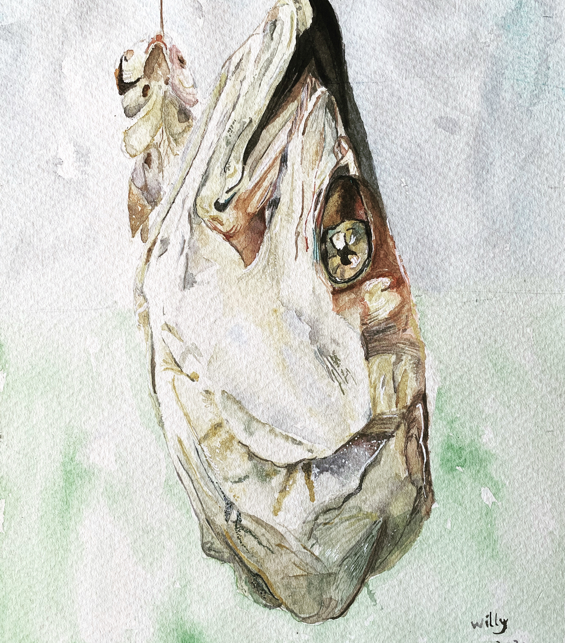 Op de haaienboerderij in IJsland worden de viskoppen opgehangen om te drogen € 175,00 inclusief lijst