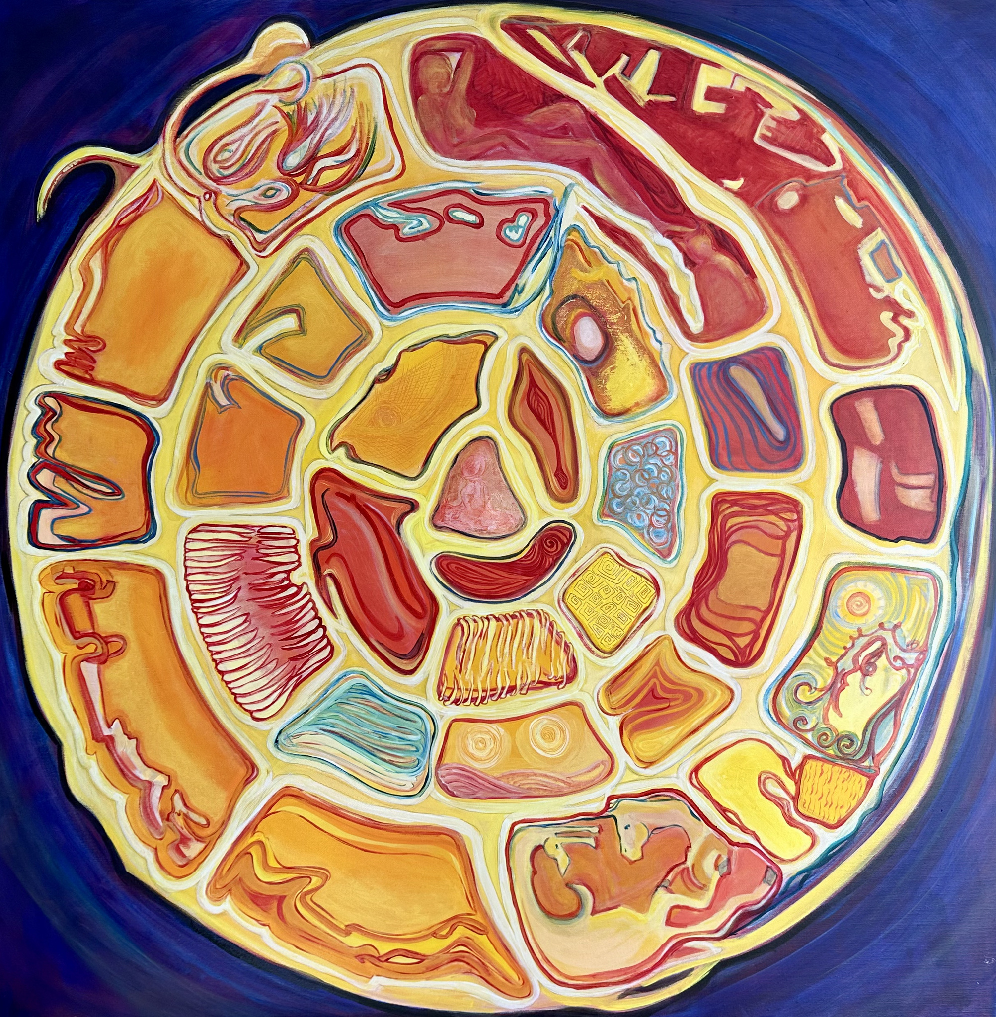 Geel/rode spiraal/schijf op een blauwe ondergrond, verdeeld in vlakken met daarin geabstraheerde voorstellingen.