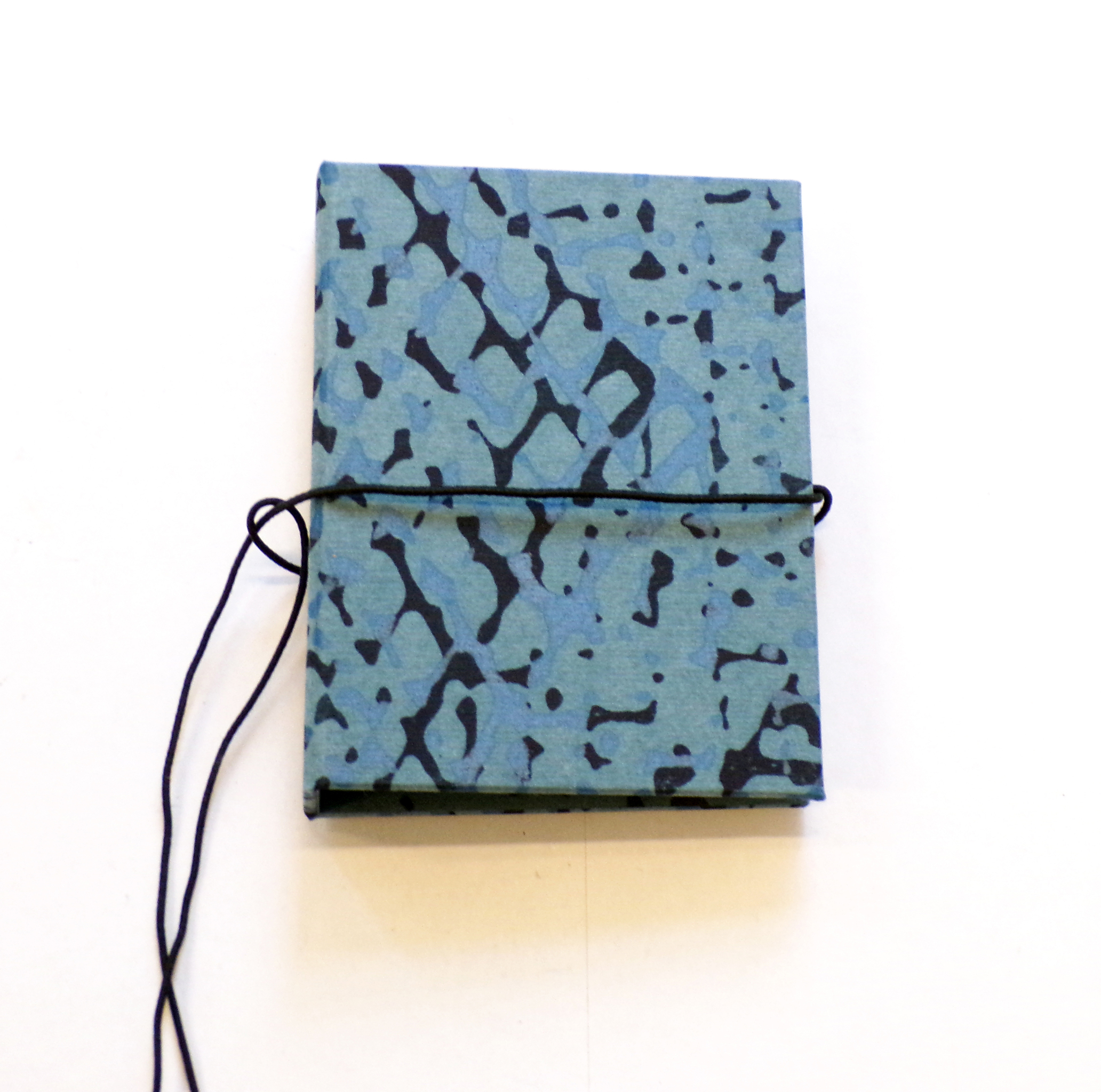 Dik boekwerkje, binnenin handgeschept donkerblauw papier, bedrukt met abstracte motieven, soms met een gezicht.