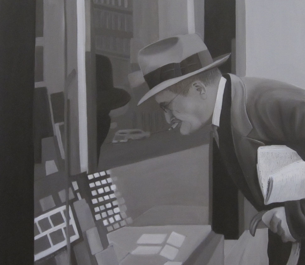Het is vooral de sfeerschepping van het geheel en de aandacht van die man aan het uitstalraam die de uitdaging vormden tot de creatie van dit werk. In het raam zien we een deel van zijn contouren in schaduw afgebeeld en ook vaag de weerspiegeling van de straat.