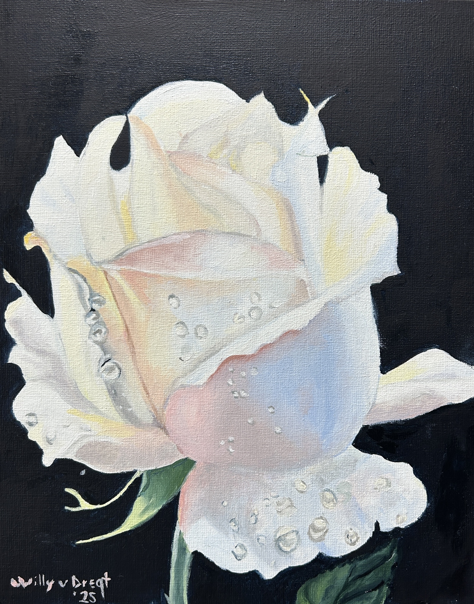 Een serene witte roos met dauwdruppels Geëxposeerd in 2025 bij het Open Atelier in Vianen. € 300,- met lijst