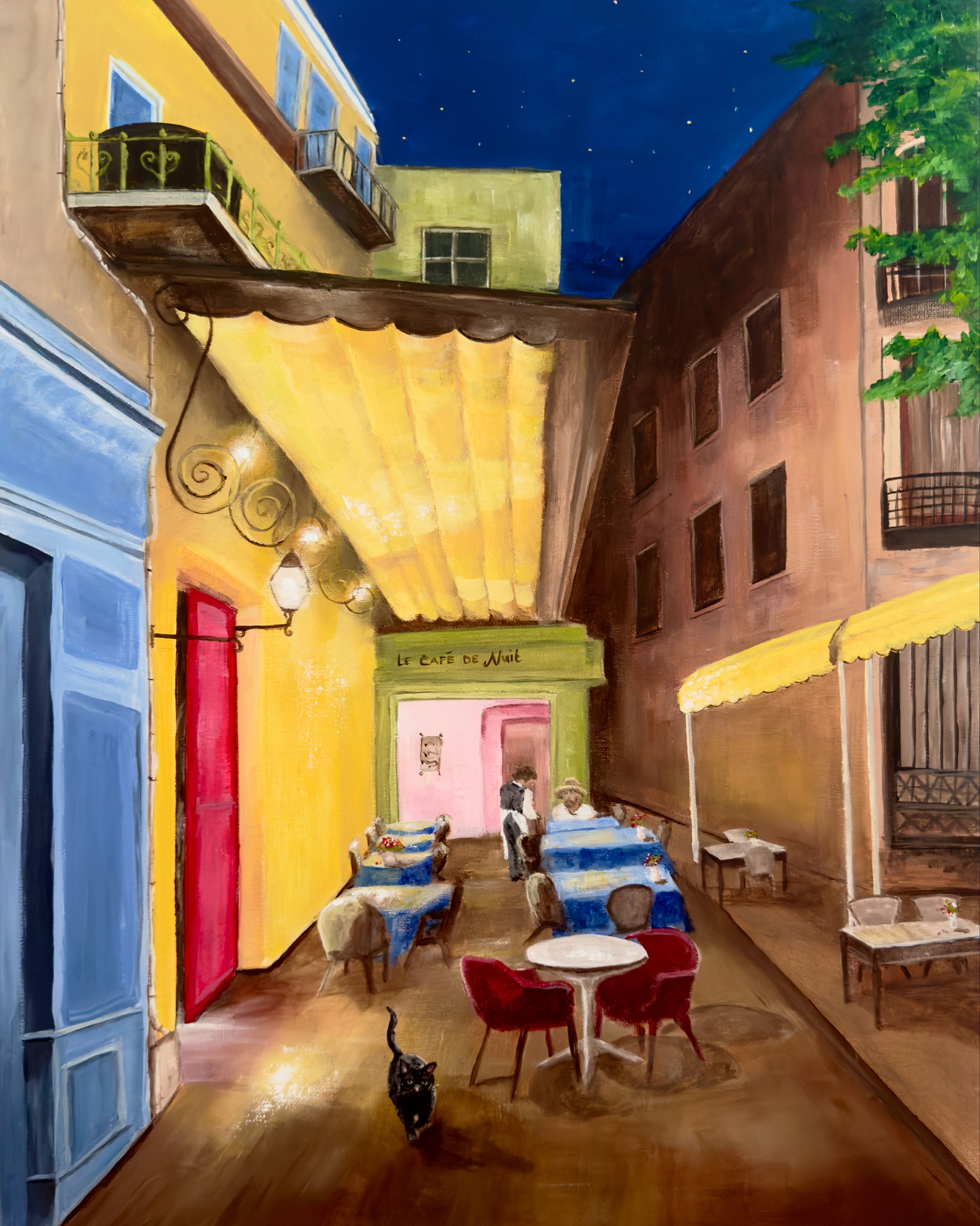 Geïnspireerd door Van Goghs beroemde werk Le Café de Nuit, met een ober, Van Gogh zelf en de zwarte kat van zijn vriend Paul Gauguin subtiel verwerkt. Dit schilderij bevindt zich in Spanje, omgeving Marbella. Woon je in de buurt en heb je interesse? Neem dan gerust contact op.
