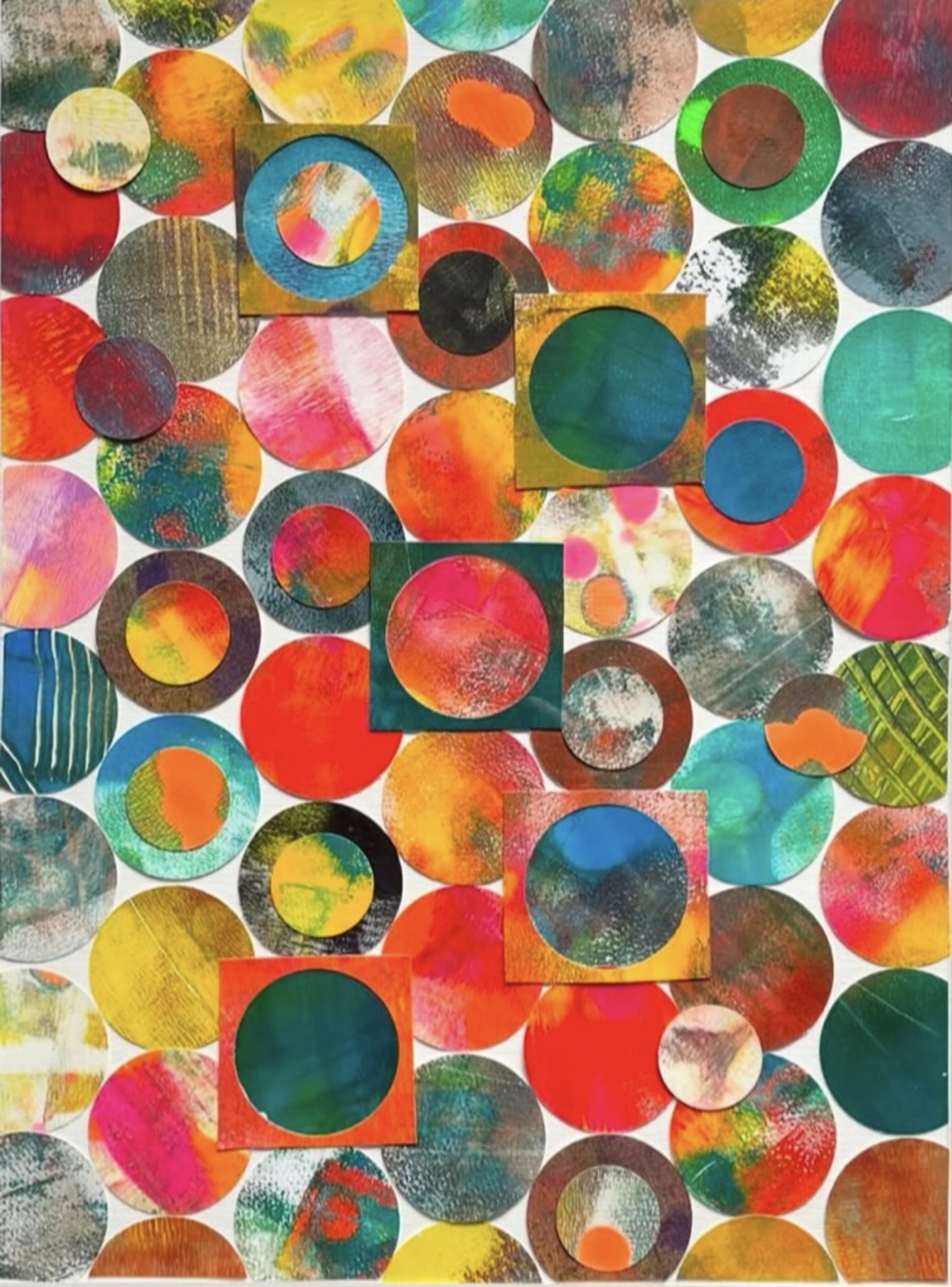 De cirkels in dit werk zijn geponst uit zelfgemaakte monoprintvellen, elk met een eigen textuur en kleur. Nadat de vellen droog zijn, worden de cirkels op gevoel in een patroon gelegd.