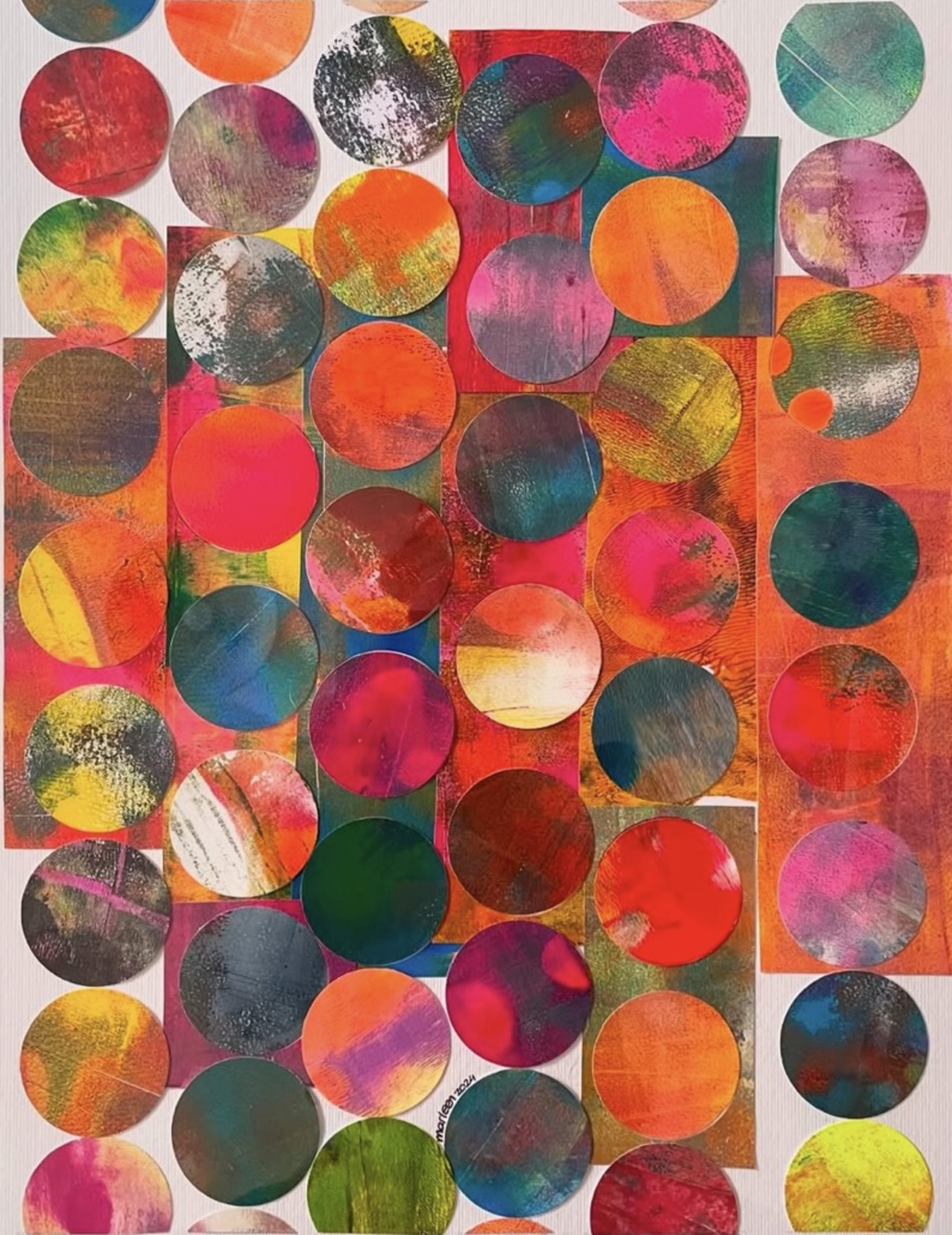 De cirkels in dit werk zijn geponst uit zelfgemaakte monoprintvellen, elk met een eigen textuur en kleur. Nadat de vellen droog zijn, worden de cirkels op gevoel in een patroon gelegd.