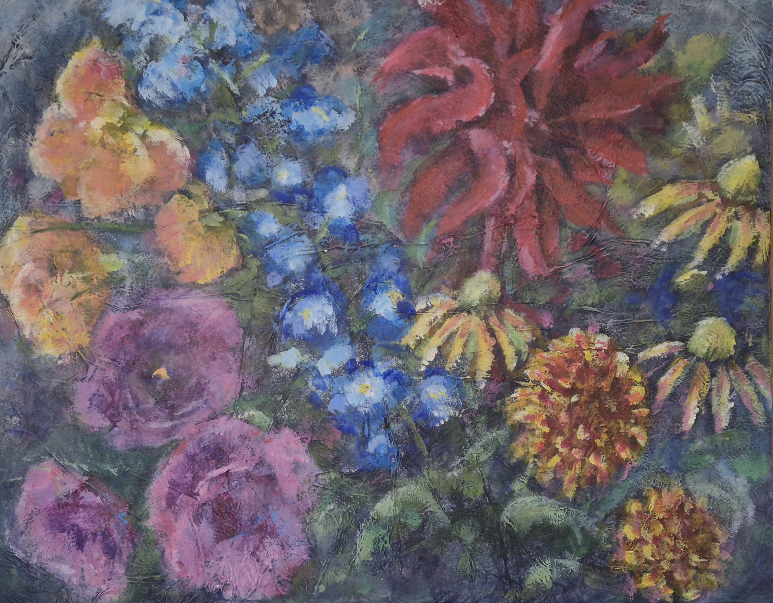 Naar eigen foto's. Geschilderd op paneel dat beplakt is met tissuepapier voor de structuur.