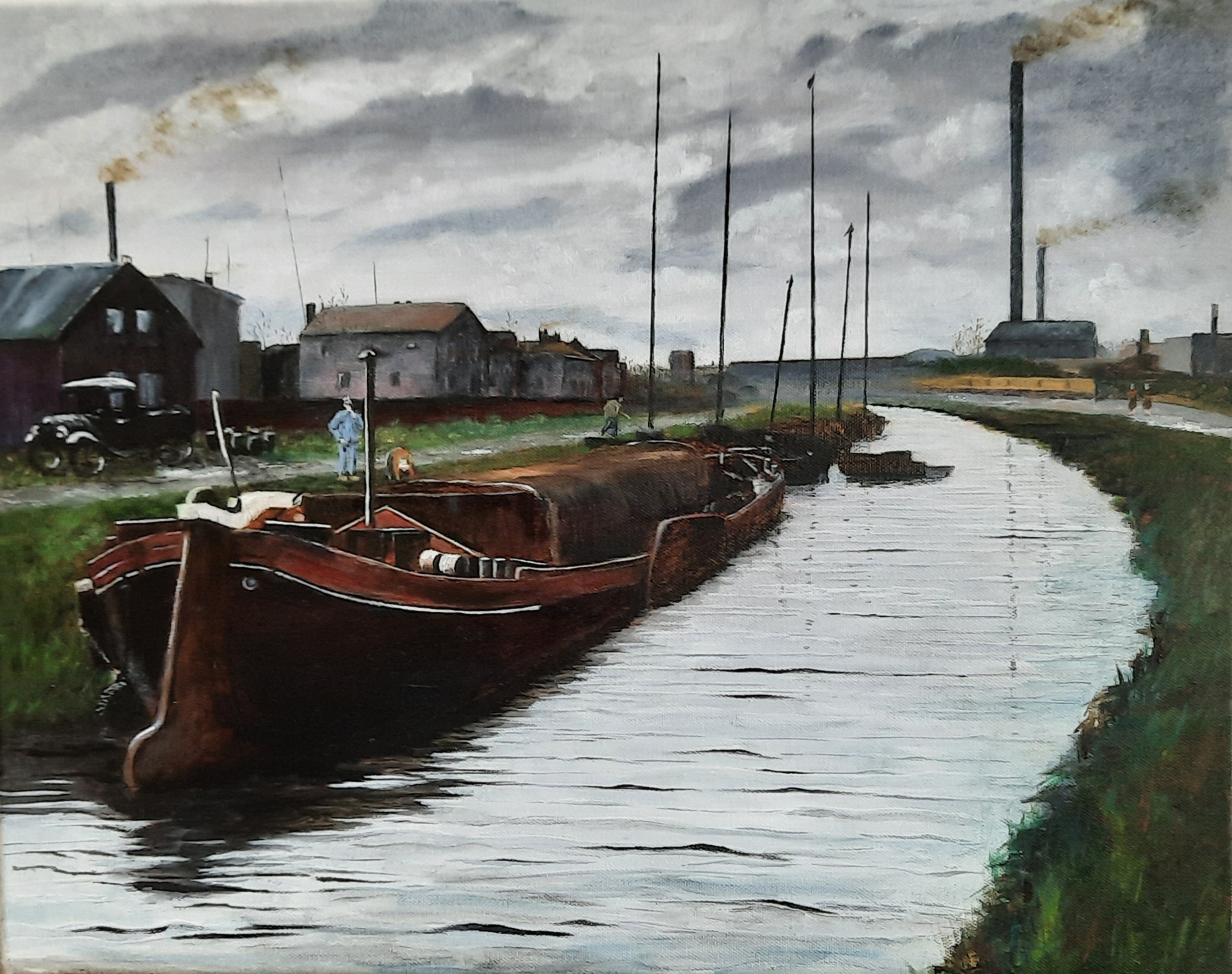 Schepen vervoeren materialen voor de textiel industrie in Almelo. Op de achtergrond de textielfabriek.