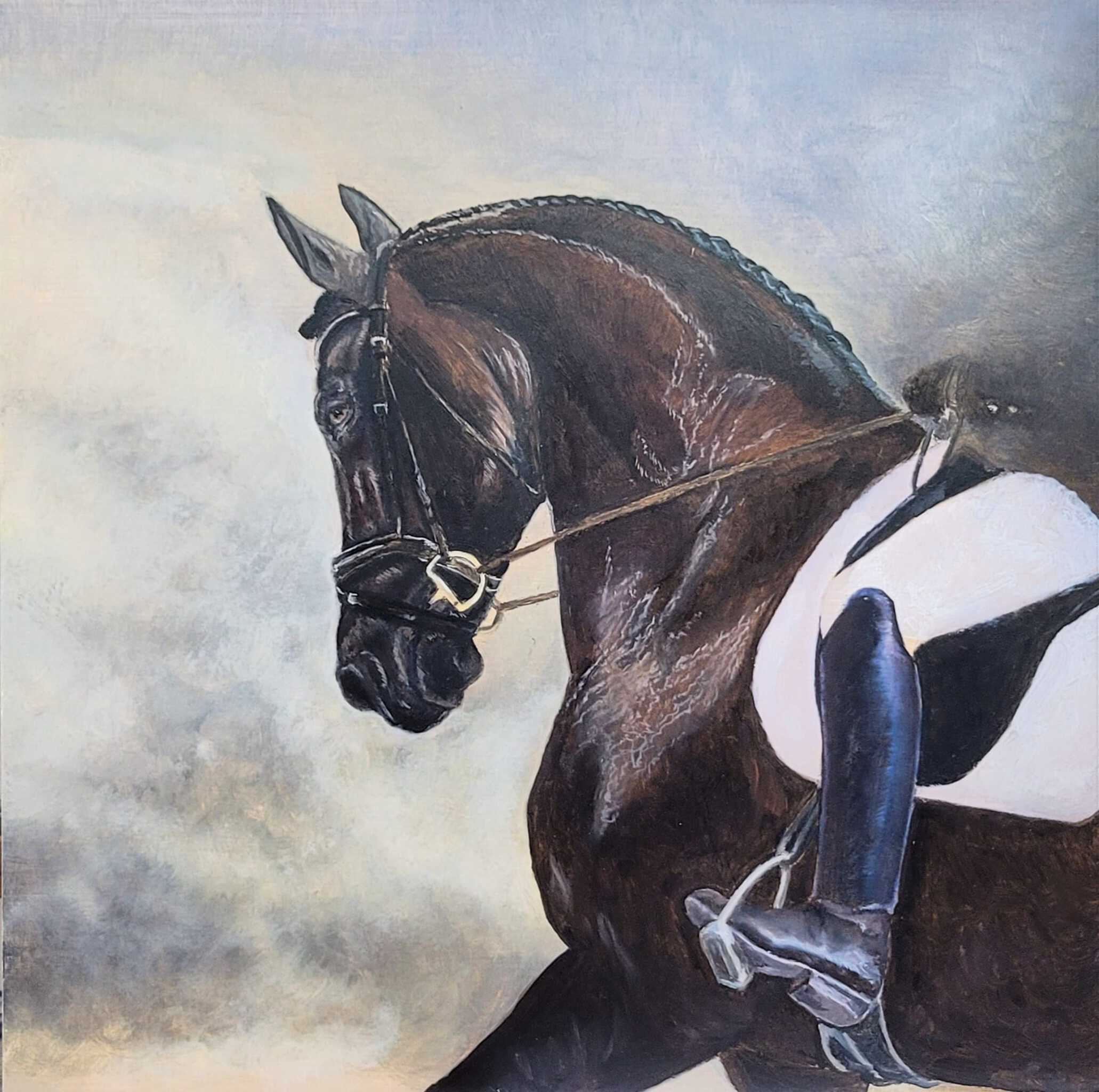 Olieverf op paneel, een weergave van een dressuur fragment waarbij de elegantie van het paard tot zijn recht komt