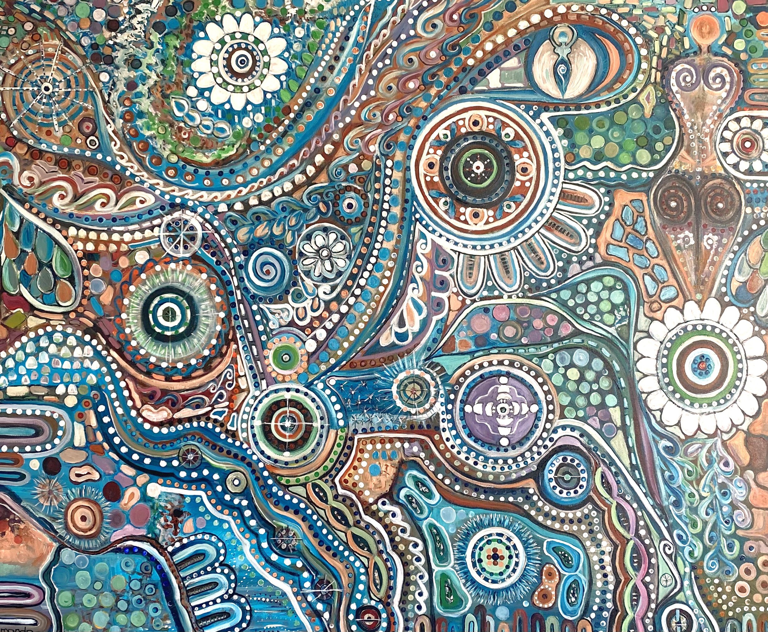 The River of Remembering This painting feels like a tapestry of memories, dreams, and nature woven together. The swirling patterns resemble flowing water, carrying fragments of life—flowers, seeds, spirals, and stars—all drifting in one great current. The white dotted paths are like ancient songlines, marking the invisible threads that connect people to the land, to each other, and to the universe. It tells a story of interconnectedness: every being, every thought, every memory becomes part of this river. The blues and greens whisper of water and growth, while earthy tones root it in the soil of lived experience. In essence, The River of Remembering is a visual map of how life carries us forward, but also how everything we are—our past, our ancestors, our environment—flows alongside us in an eternal dance.