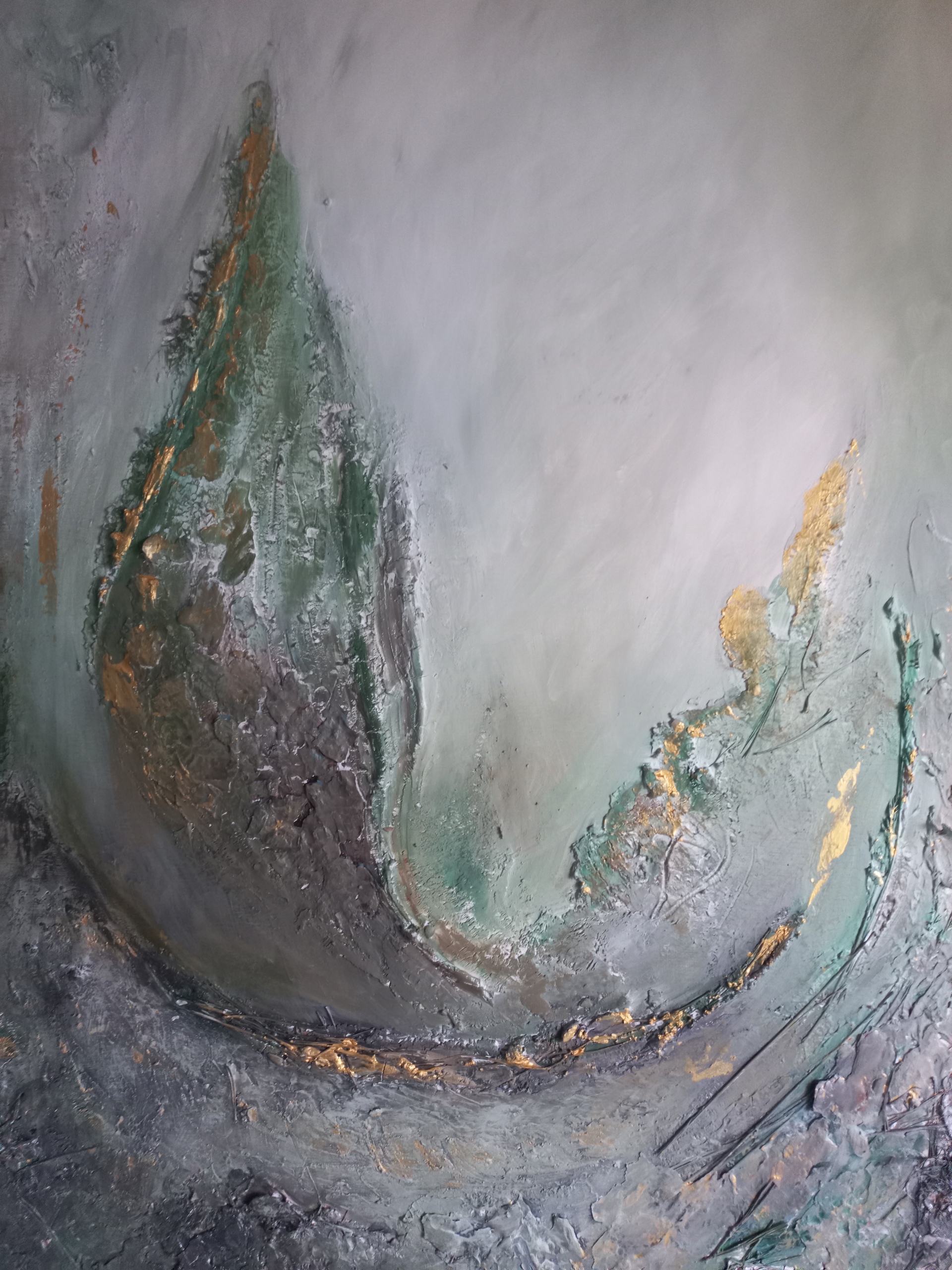 Acryl, mixed media. Diverse natuurlijke materialen zijn verwerkt in het schilderij