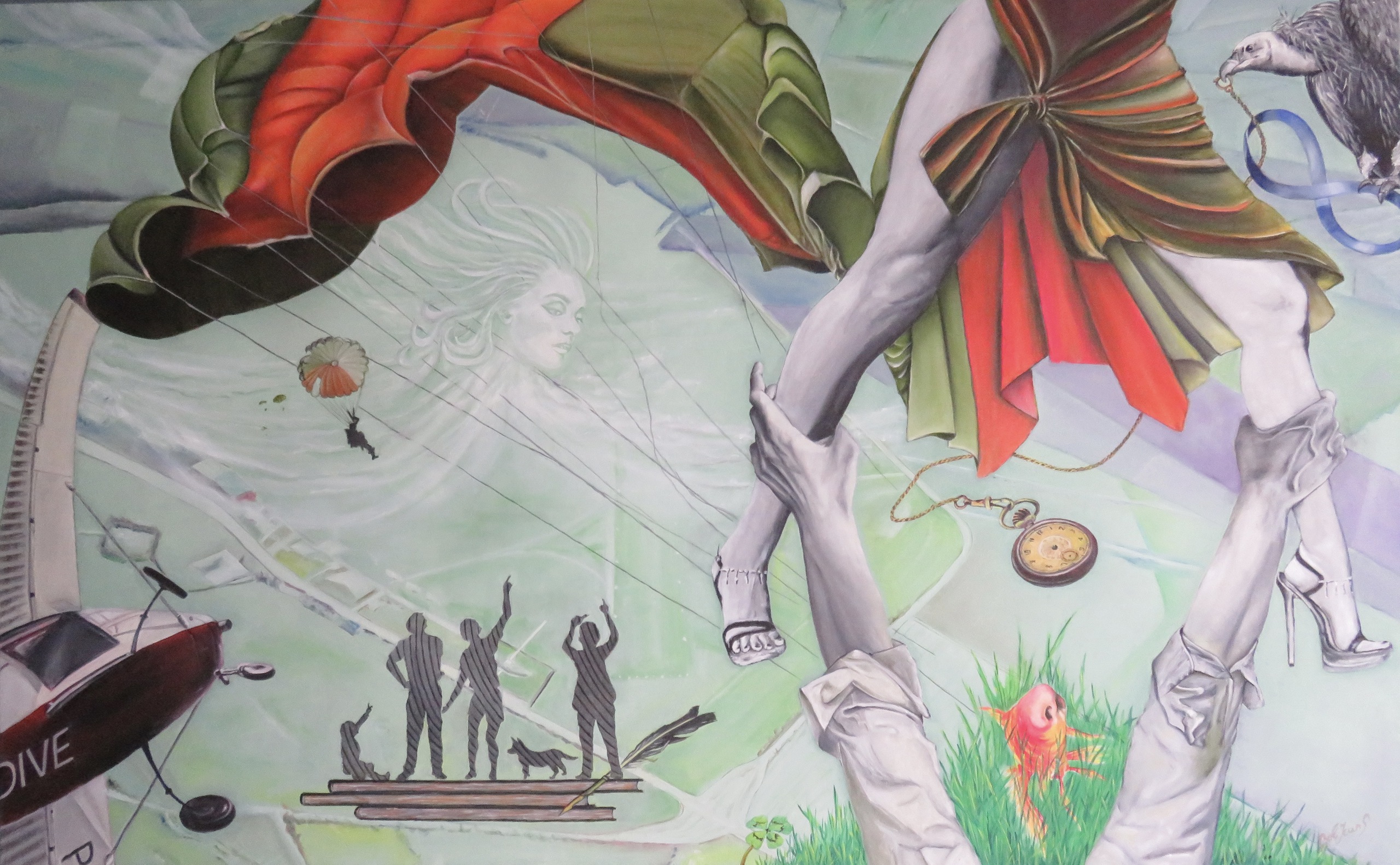 Reeds jaren had ik het idee om deze ervaring op doek te zetten. Uiteindelijk waas het een goede vriend waar ik samen een expo mee had in 2019 die me overhaalde om het te schilderen. Dit werk heet ‘De geur van gras’.. Op de achtergrond een luchtfoto van het vliegveld in Schaffen. Het stelt mijn accident voor in vrije val met mijn parachute in 1973 te Schaffen. De geur van het gras was mijn eerste ervaring toen ik op de grond lag happend nauar lucht als een vis op het droge toen ik de eerste teug adem naar binnen hapte. Toen besefte ik dat ik nog leefde. Mijn hoofdparachute opende zich als een toorts , de reservepara draaide zich er omheen bij het opentrekken. Als een tol draaide ik rond mijn parachutes en zag de grond met rasse schreden naar me toekomen. Ik besefte dat ik te pletter stortte en de dood tegemoet ging De gier zittend op het oneindige wachtend op een maaltijd. Een horloge zonder wijzers die geen tijd meer aangeeft. Mijn armen wijd open voor een vergeefse poging mijn parachute te openen. Verwonderde mensen die toekijken op boeken die ik had kunnen volschrijven met de gedachten die mijn hersens vulden tot barstens toe. Tussen de wolken mijn reddende engel.