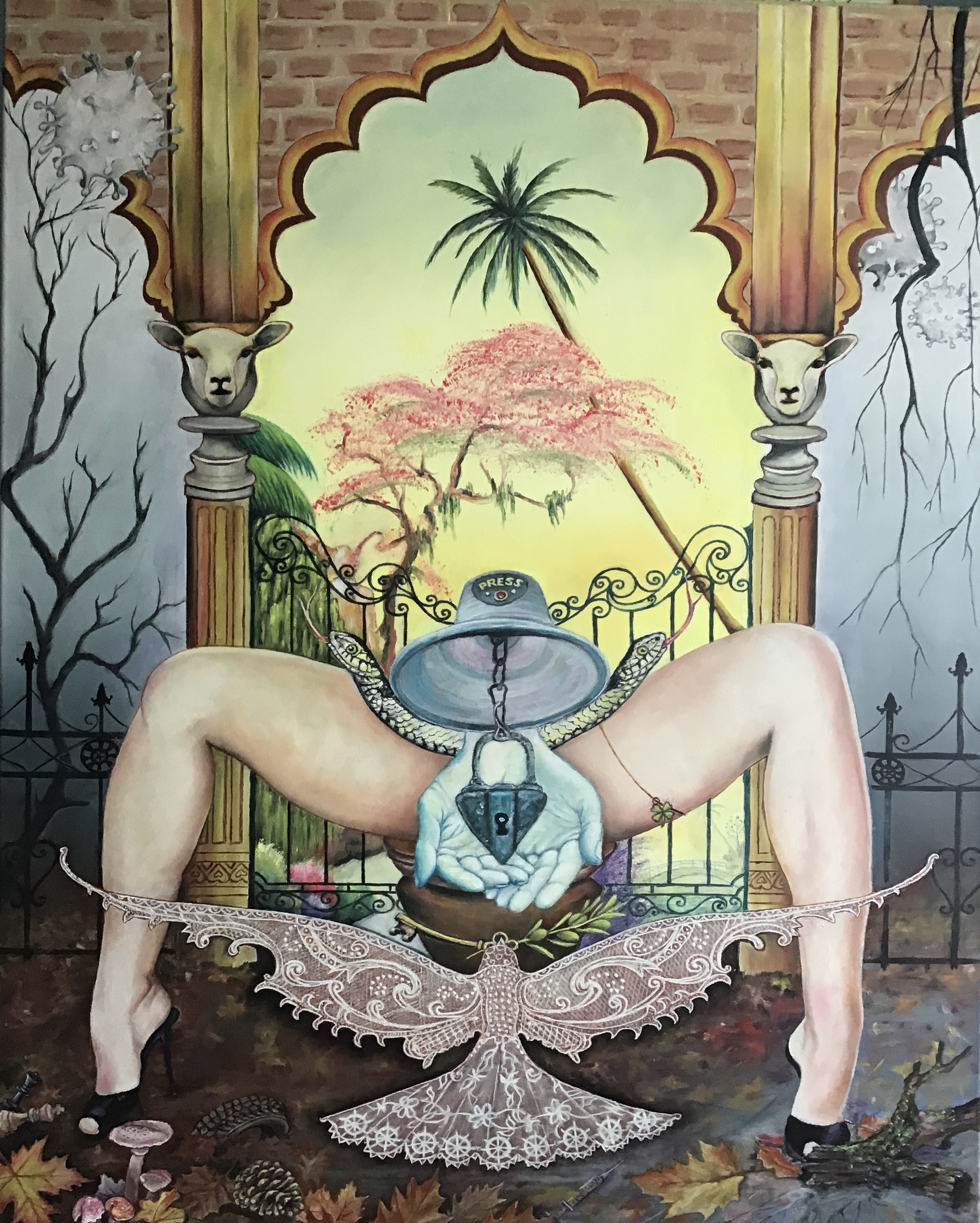 Het geeft mijn indruk weer over de Corona pandemie dat jaar met de daarbijbehorende (onzinnige) lockdowns . Moeder aarde wordt gesymboliseerd door de vrouwenbenen. De handen dragen het slot(lockdown) . De vredesduif rijkt de sleutel aan met olijftak (vrede) . De troosteloze donkere herfst, met bovenaan de virussen, staat symbool voor het jaar 2020 waarbij onze vrijheid sterk beperkt werd. Achter de gesloten poort bevindt zich de zomer met zijn prachtige kleurrijke natuur, het “oude normaal” , wachtende op een heropening. De slangen, het kwade in de wereld. De pilaren met de schapenkoppen, de volgzame menigte met angst voor het virus. De bel met “PRESS” of reset knop voor de onbekende toekomst.