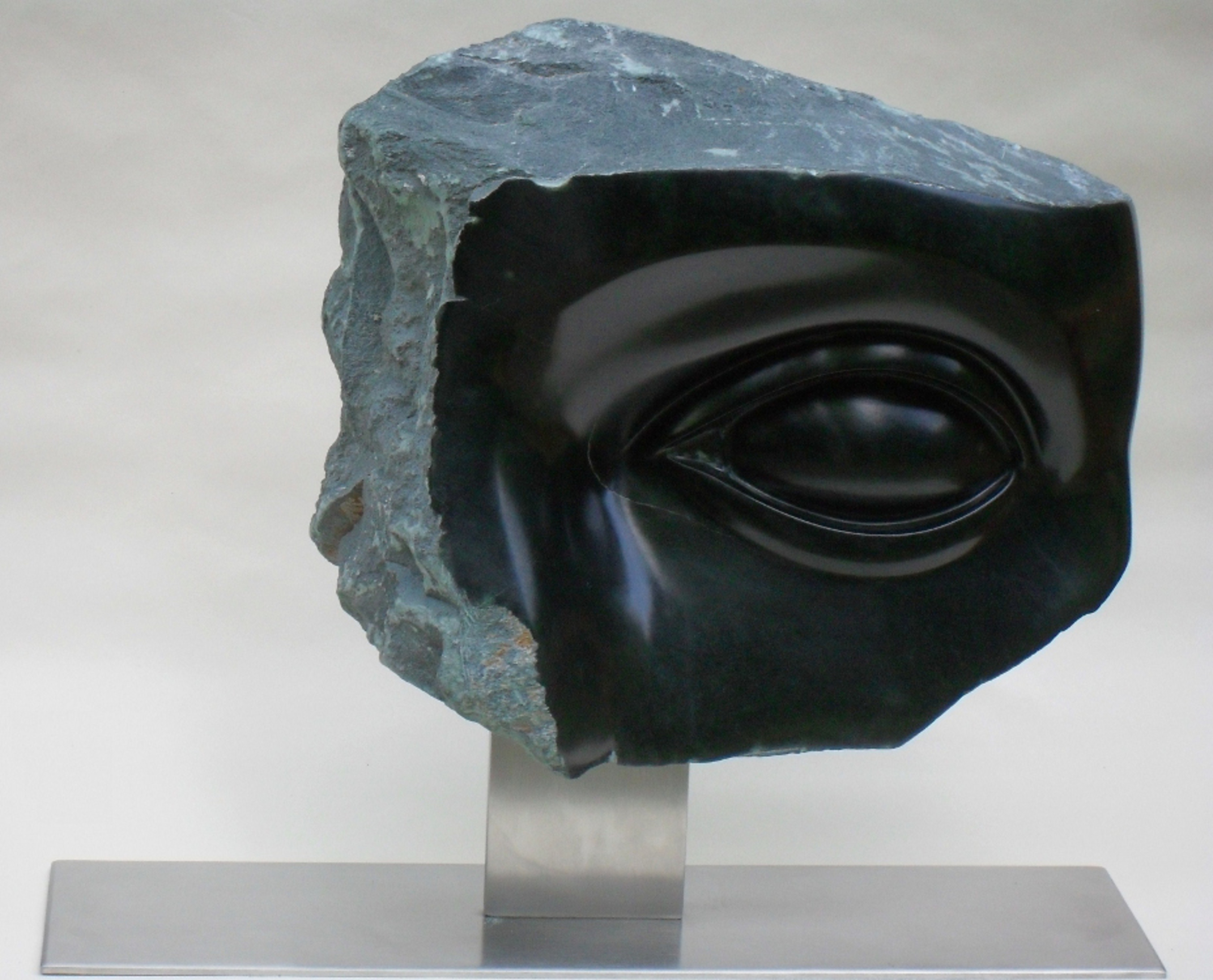 iStone is een uitvergroot oog van zwarte serpentijn en geplaatst op een RVS sokkel