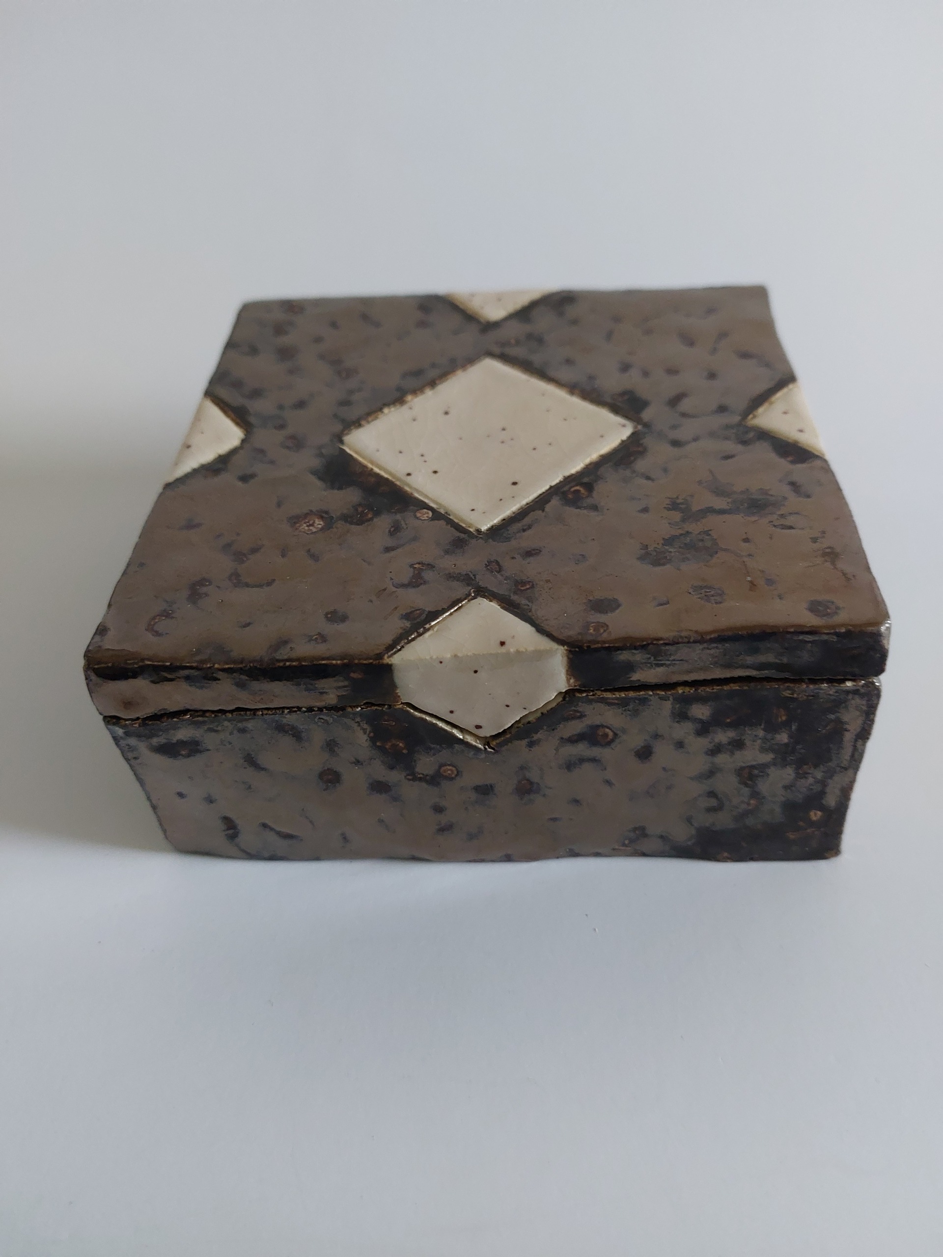 Vierkant doosje met mooie binnenkant. Gestookt 1100 graden. Binnenkant cremekleur. Geschikt als herinneringsdoosje.