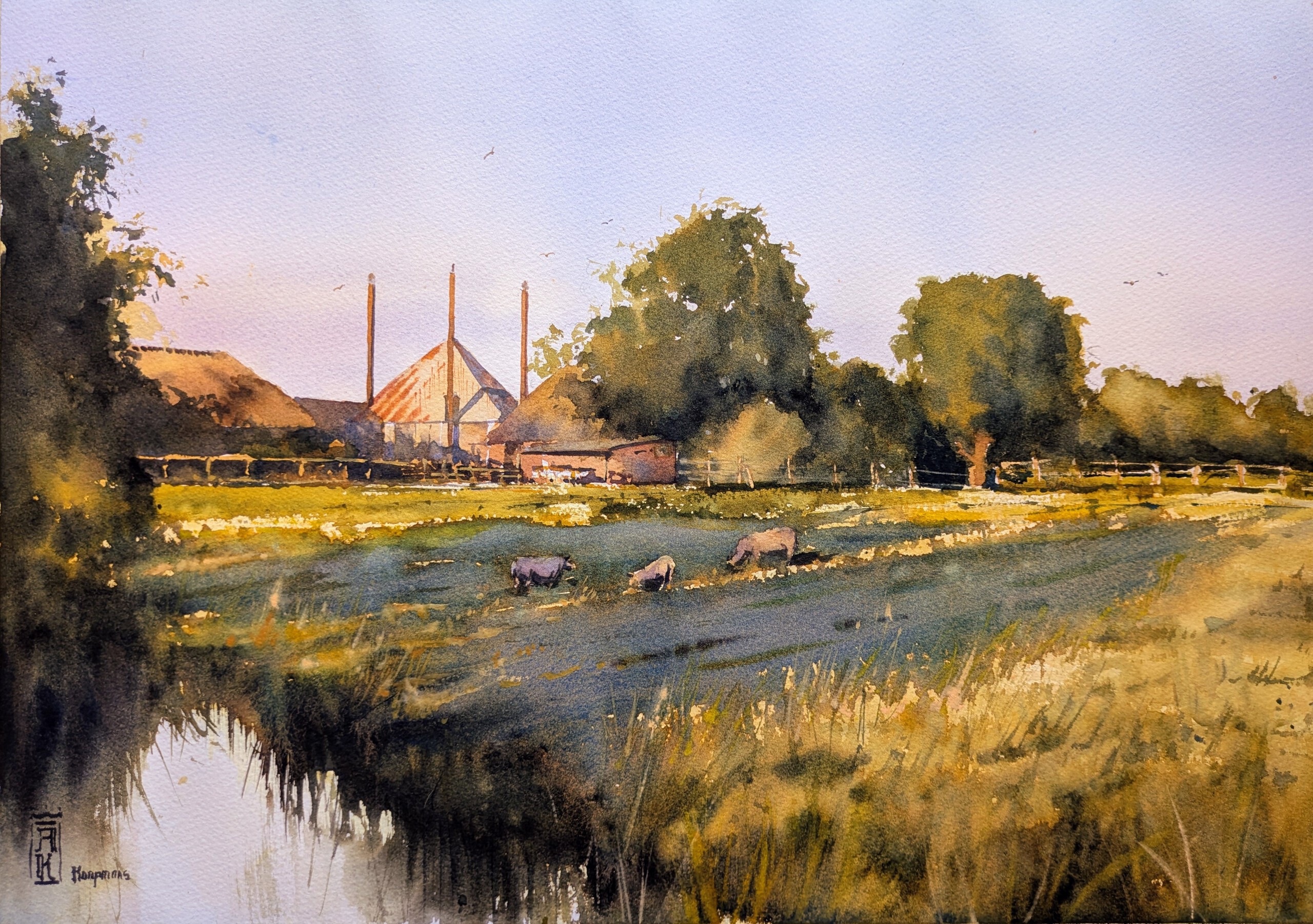 Schilderij Aquarel Realistisch Natuur Painting Polder Watercolor Schapen Boerderij Farm Sheep Avond Countryside Platteland