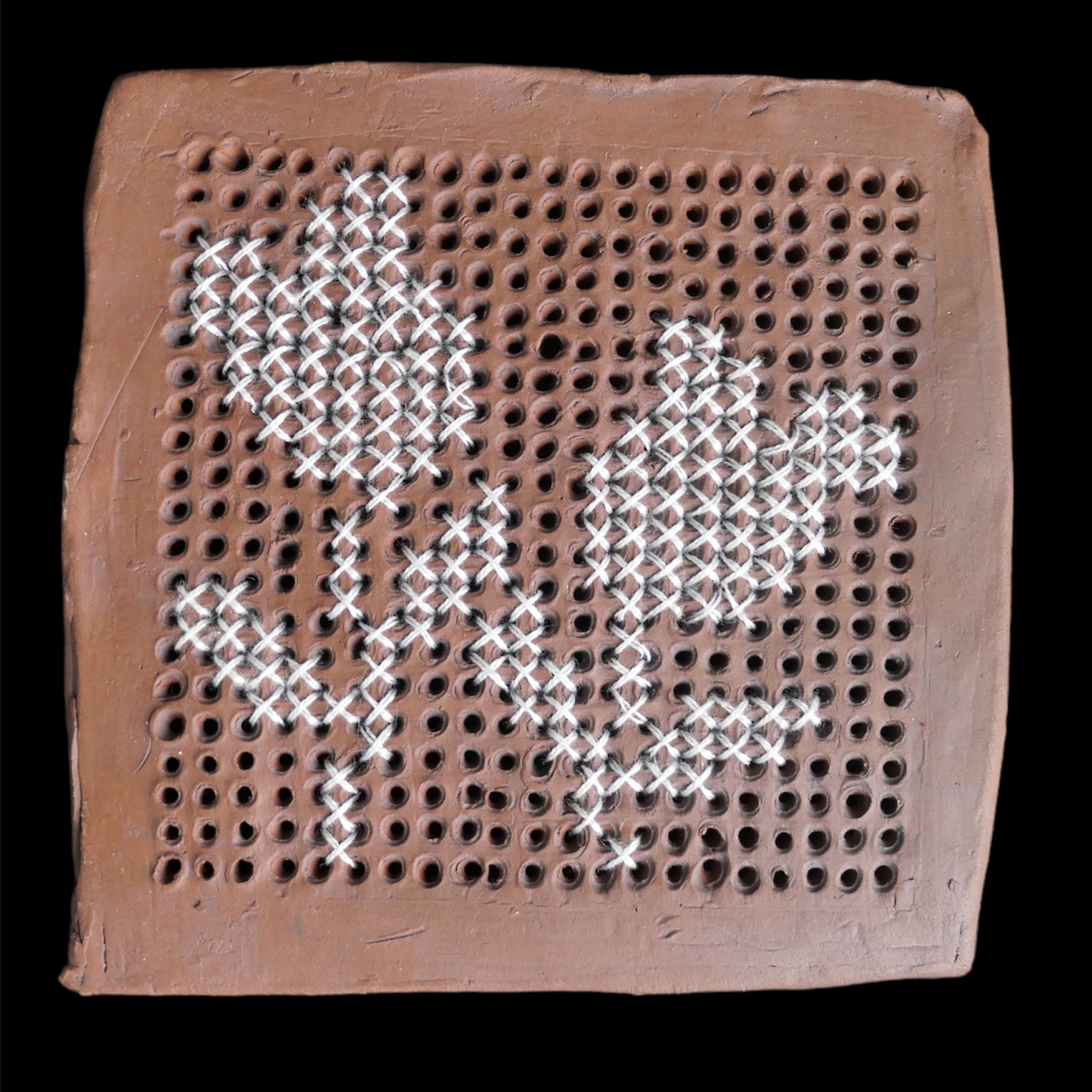 De tulpen zijn geborduurd op een eigengemaakt borduurplaatje van terra cotta klei.
