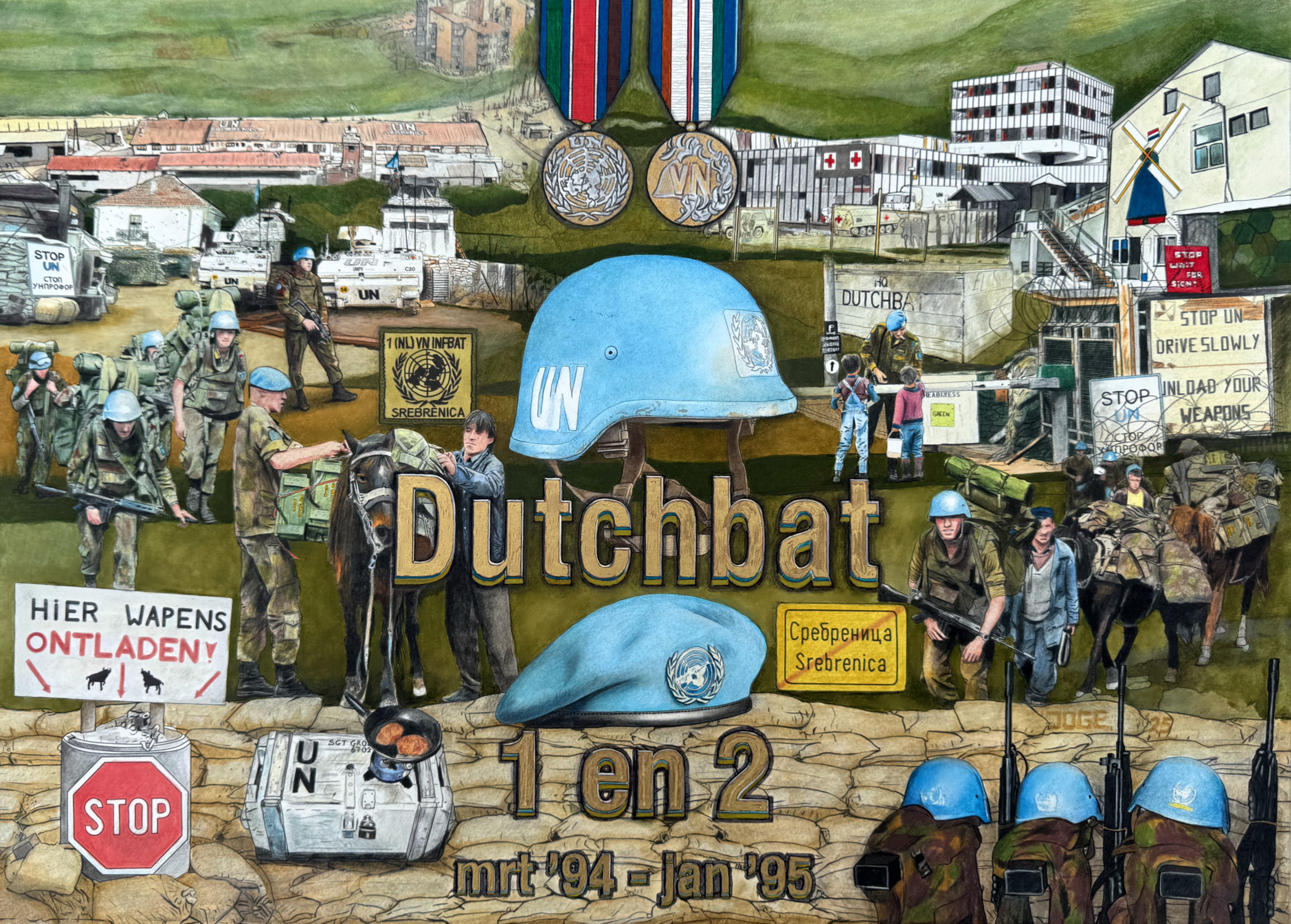 Ter gelegenheid van de reunie van 30jr Dutchbat 1 en 2 is deze tekening gemaakt. Getoond worden afbeeldingen van diverse compounds waar vanuit de Dutchbatters opereerden onder vaak fysiek zware omstandigheden. Ook zijn afgebeeld kenmerkende zaken die deze uitzending beïnvloedde als ook heel erg veel zandzakken.