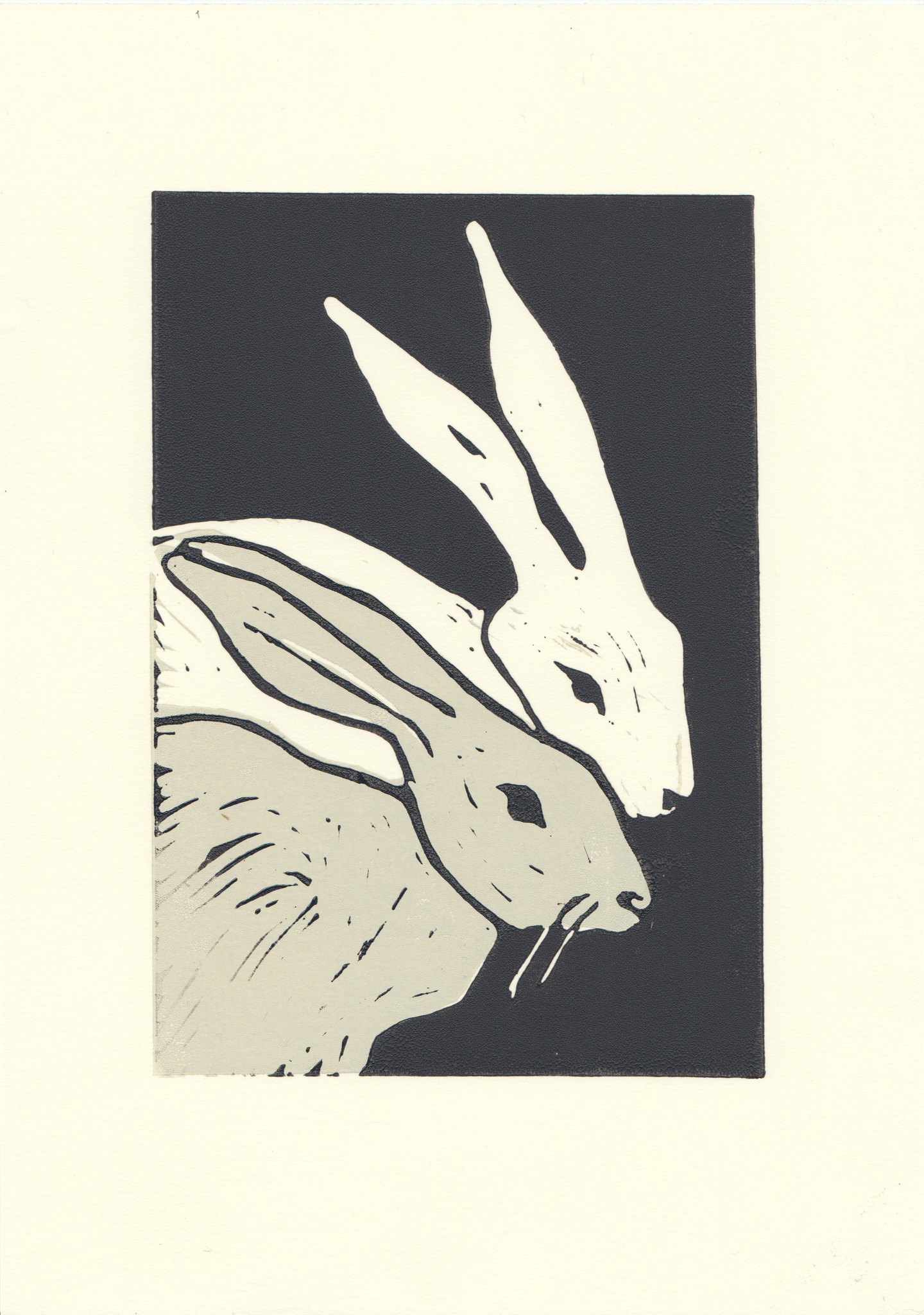 Twee Hazen. Dicht bij elkaar. Linosnede eigen druk.