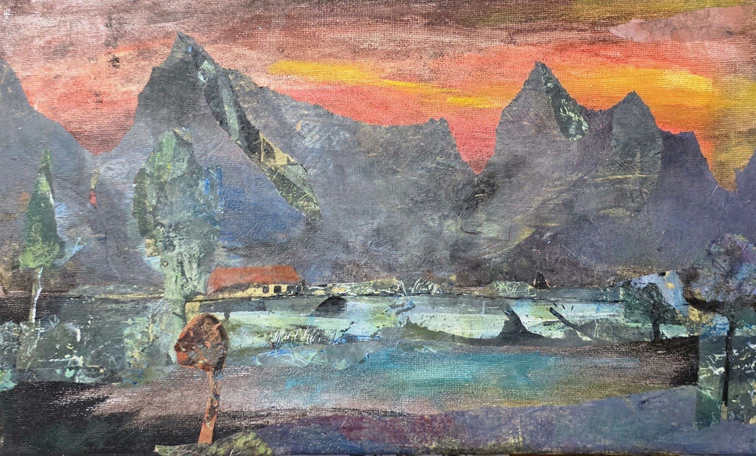 Dicht bij de bergen, geinsprireerd door de schoonheid van deze bergen in de Verenigde Staten. Doekje en handgedrukt papier, verf en kleurpotlood.