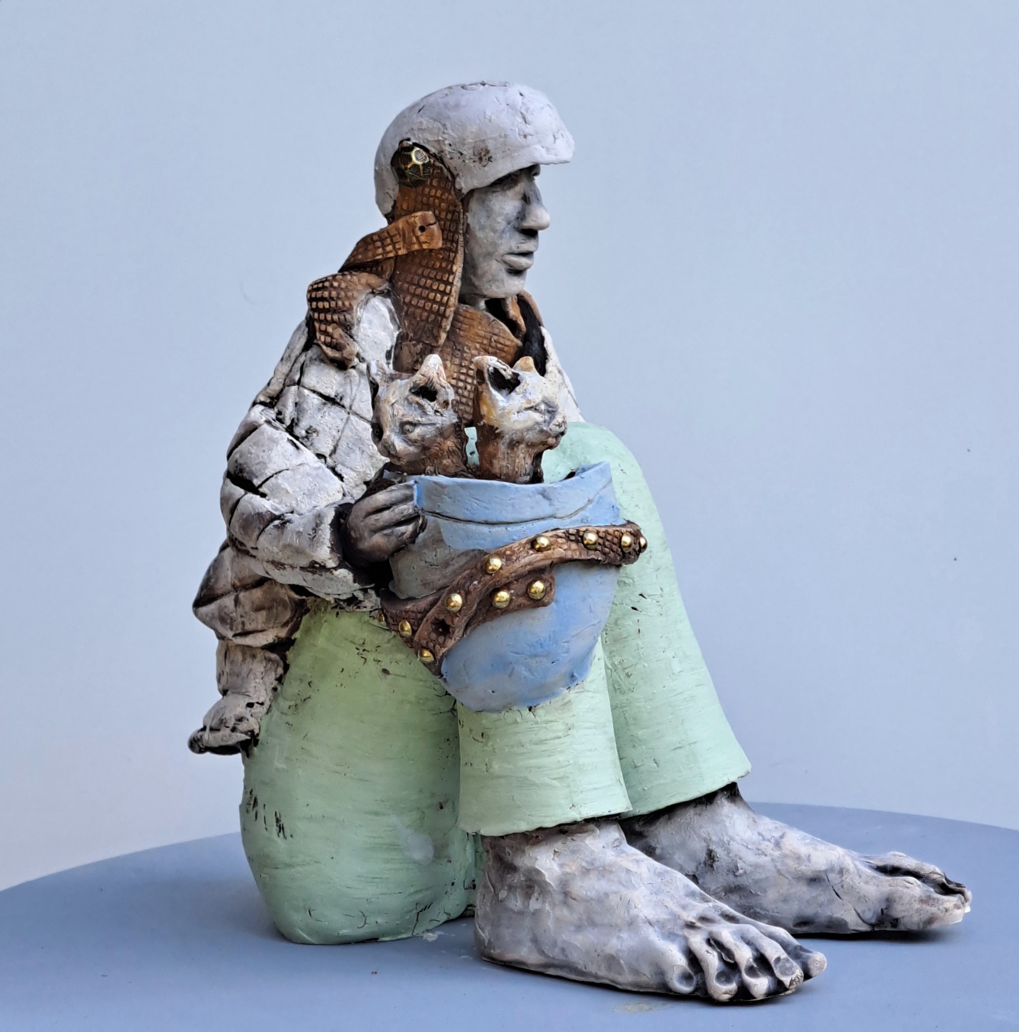 Deze man is gek op zijn katten . Hij draagt ze zorgvuldig in een mandje. Een witte jas , een groene broek en grote blote voeten, Versierd met koperen elementen en goudluster. Deze sculptuur van keramiek is drie keer gestookt in de keramiekoven op 1045 graden . Gekleurd met oxides en zachte tinten. Gemaakt met passie, vakmanschap en humor. Speciaal voor de kattenliefhebbers. Meer foto,s en video op aanvraag