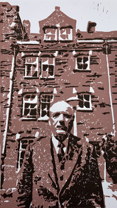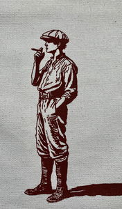 Japi, de hoofdpersoon uit Nescio’s De Uitvreter, is hier alleen afgebeeld: peinzend, stil, in zichzelf verzonken. Zijn houding vangt het wezen van Nescio’s wereld — eenvoud, eenzaamheid, en de poëzie van het nietsdoen. De sobere zeefdruk op textiel verwijst naar de verstilling van de Watergraafsmeer, waar Nescio zelf schreef. Een beeld van stilte, maar ook van vrijheid: Japi als dromer die zich onttrekt aan alles wat moet.