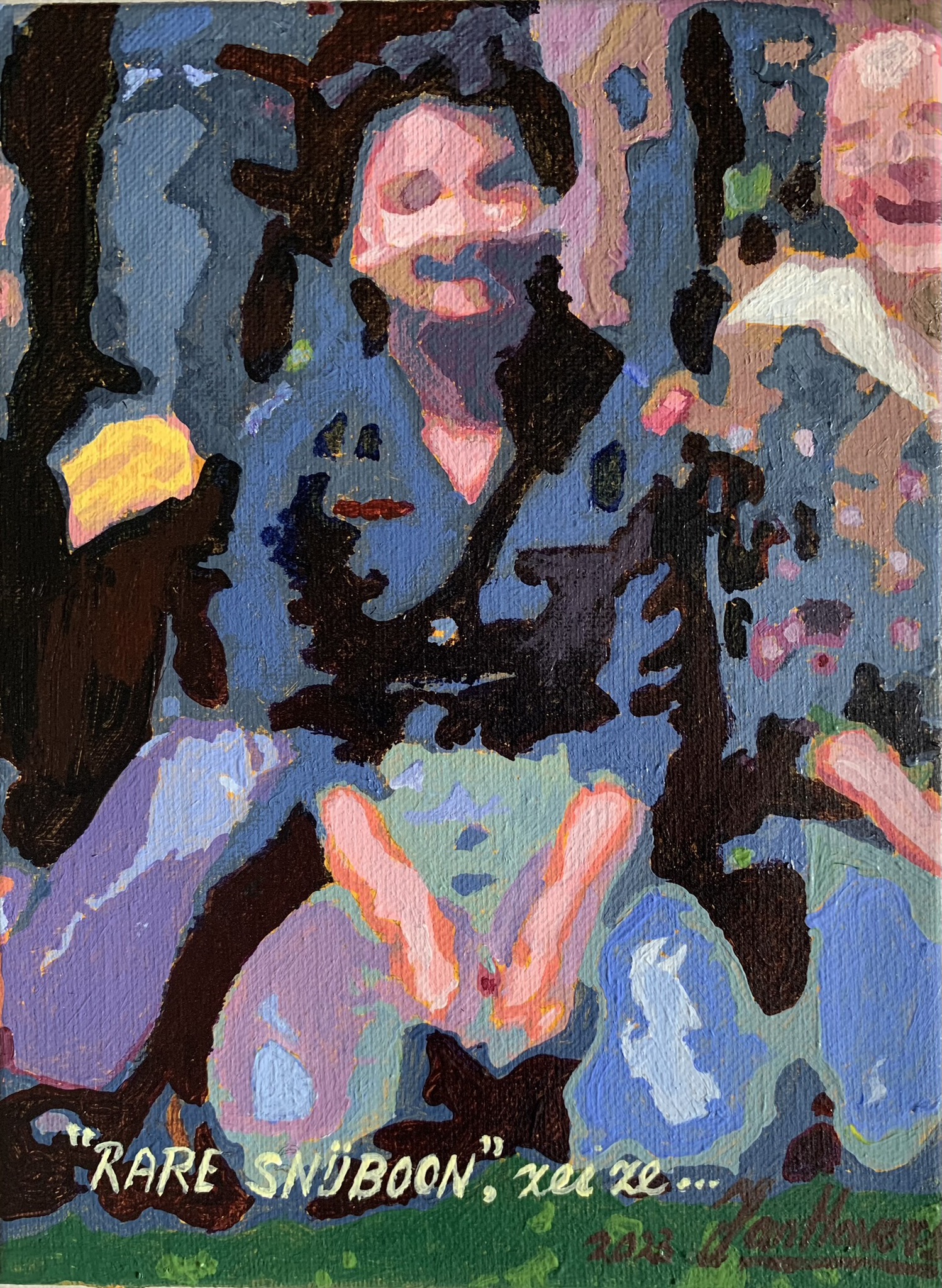 Een geschilderde puberherinnering vol ironie en tederheid. “Rare snijboon,” zei ze… verwijst naar een voorval uit mijn middelbare-schooltijd — een ontmoeting die even pijnlijk als ontroerend was. In felle kleuren en grove vlakken vangt het schilderij het gevoel van verlegen verliefdheid, verwarring en humor. Een ode aan de jonge ik, aan de kwetsbare dromer die zich schaamt, bloost en leert dat herinneringen de tijd overstijgen.